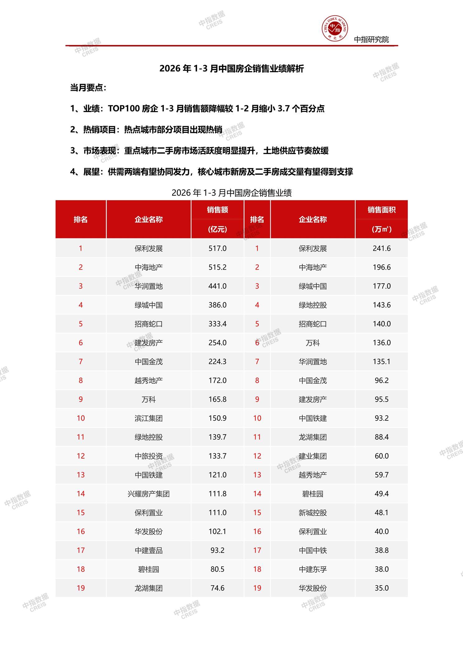 • [摘要] 2026年1-3月中国房企销售业绩解析