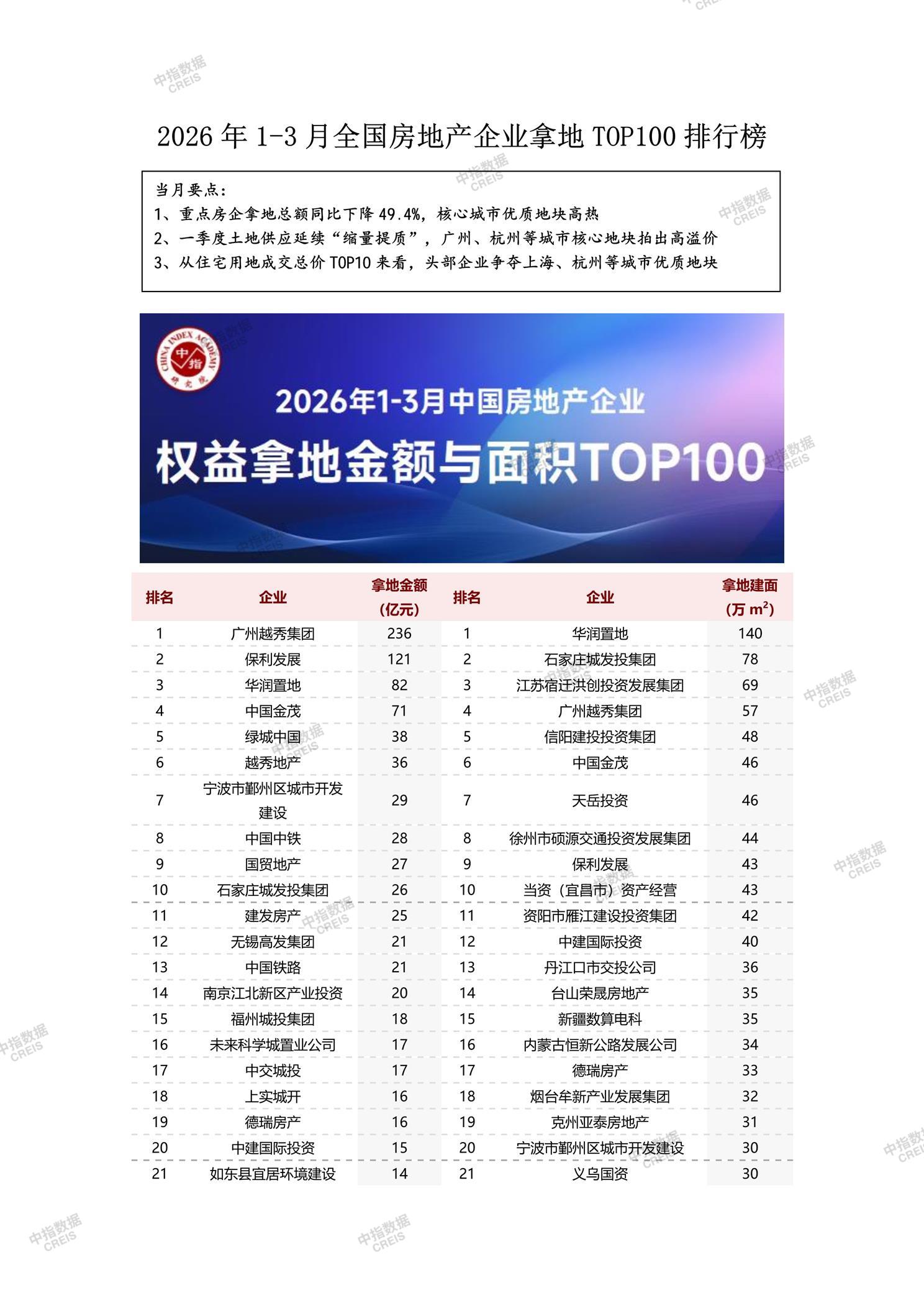 2026年1-2月全国房地产企业拿地TOP100排行榜