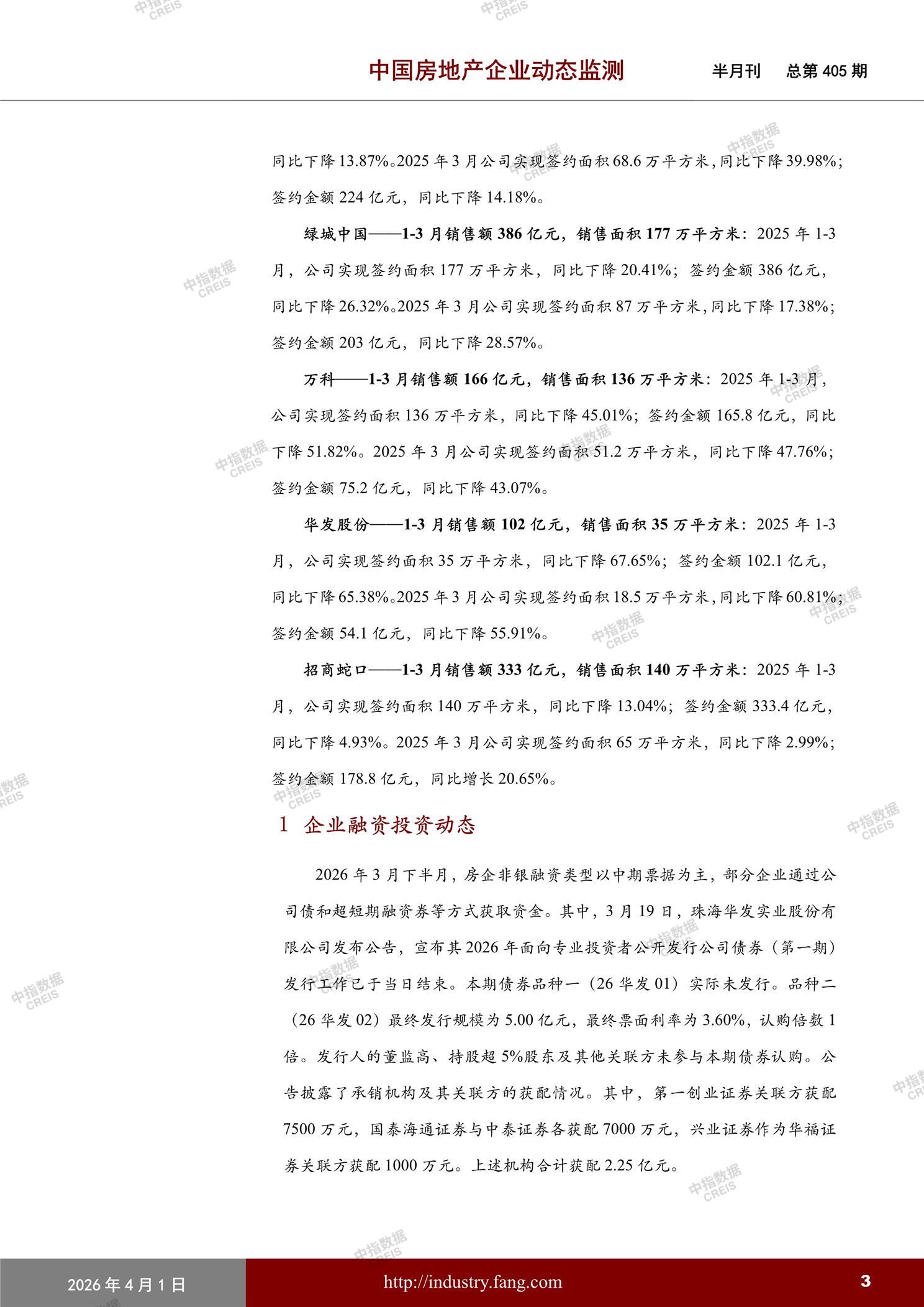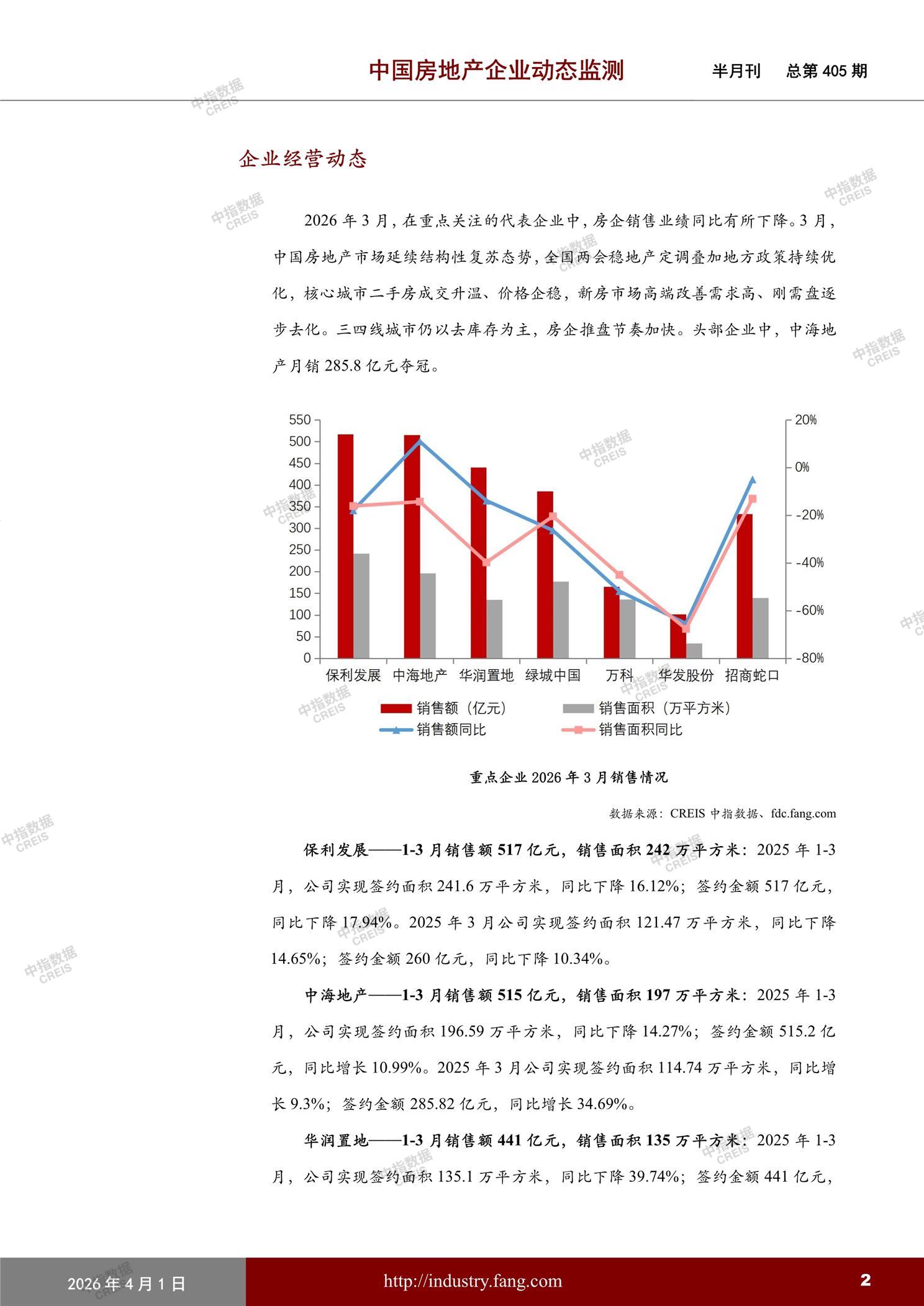 [摘要] 2026年3月中国房地产市场呈现结构性复苏,核心城市二手房成交回暖,新房市场高端改善需求旺盛,但房企整体销售业绩同比有所下降。中海地产以285.8亿元单月销售额位居榜首,保利发展、华润置地紧随其后。融资方面,房企以中期票据为主,如郑州城发集团发行3亿元中期票据,利率2.1%;南京金融城建设发行7亿元绿色中期票据,利率1.95%。土地市场方面,保利发展以51亿元竞得上海长宁区综合用地,建发房产联合体以26亿元摘得厦门湖里区住宅用地。重大事项包括中建玖合与香港新华集团签署战略协议,聚焦文化地产与城市更新。整体来看,市场分化明显,头部企业通过多元化融资和核心城市拿地维持优势。 【此内容为AI自动生成】