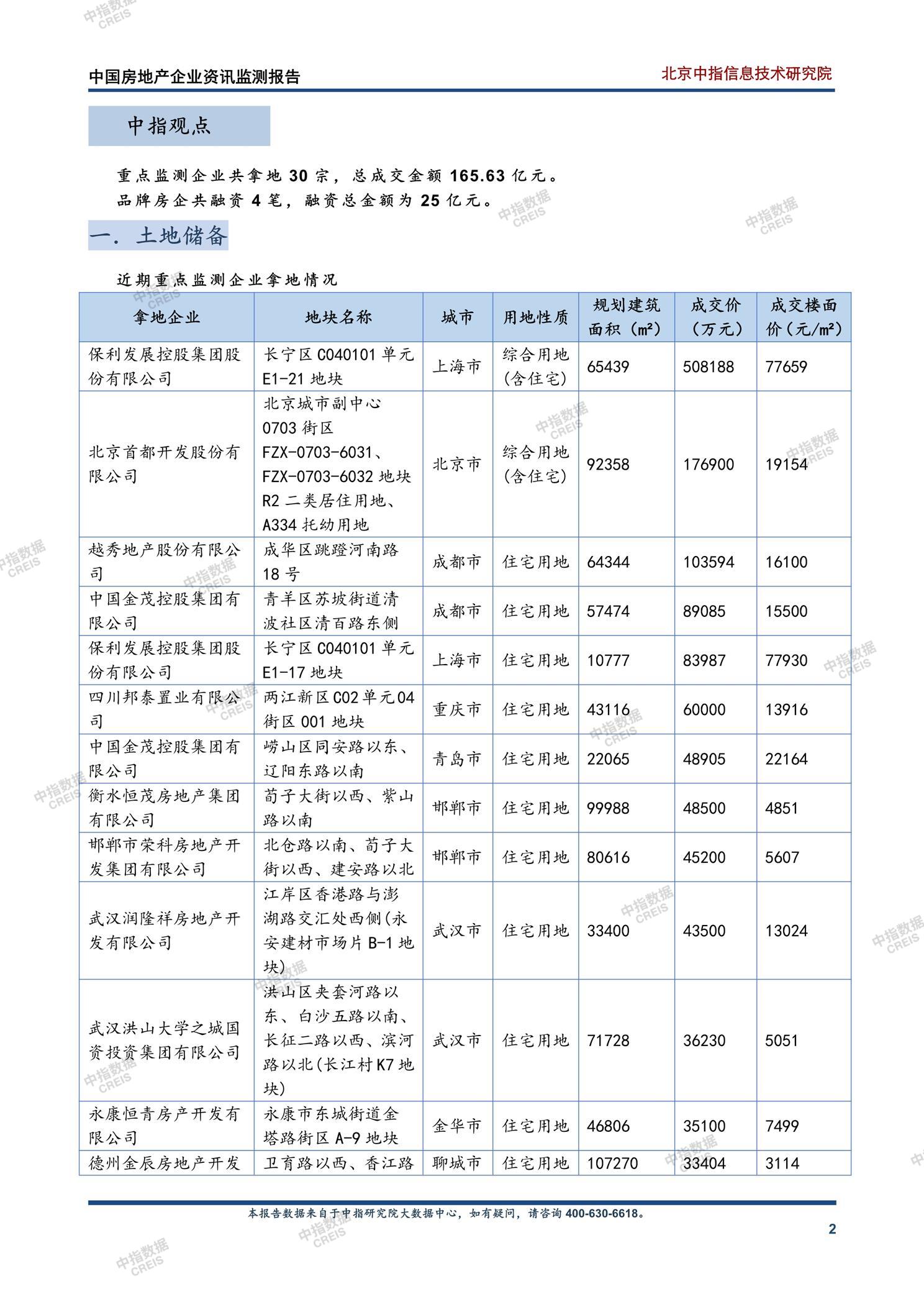 • [摘要] 重点监测企业共拿地30宗,总成交金额165.63亿元。 品牌房企共融资4笔,融资总金额为25亿元。