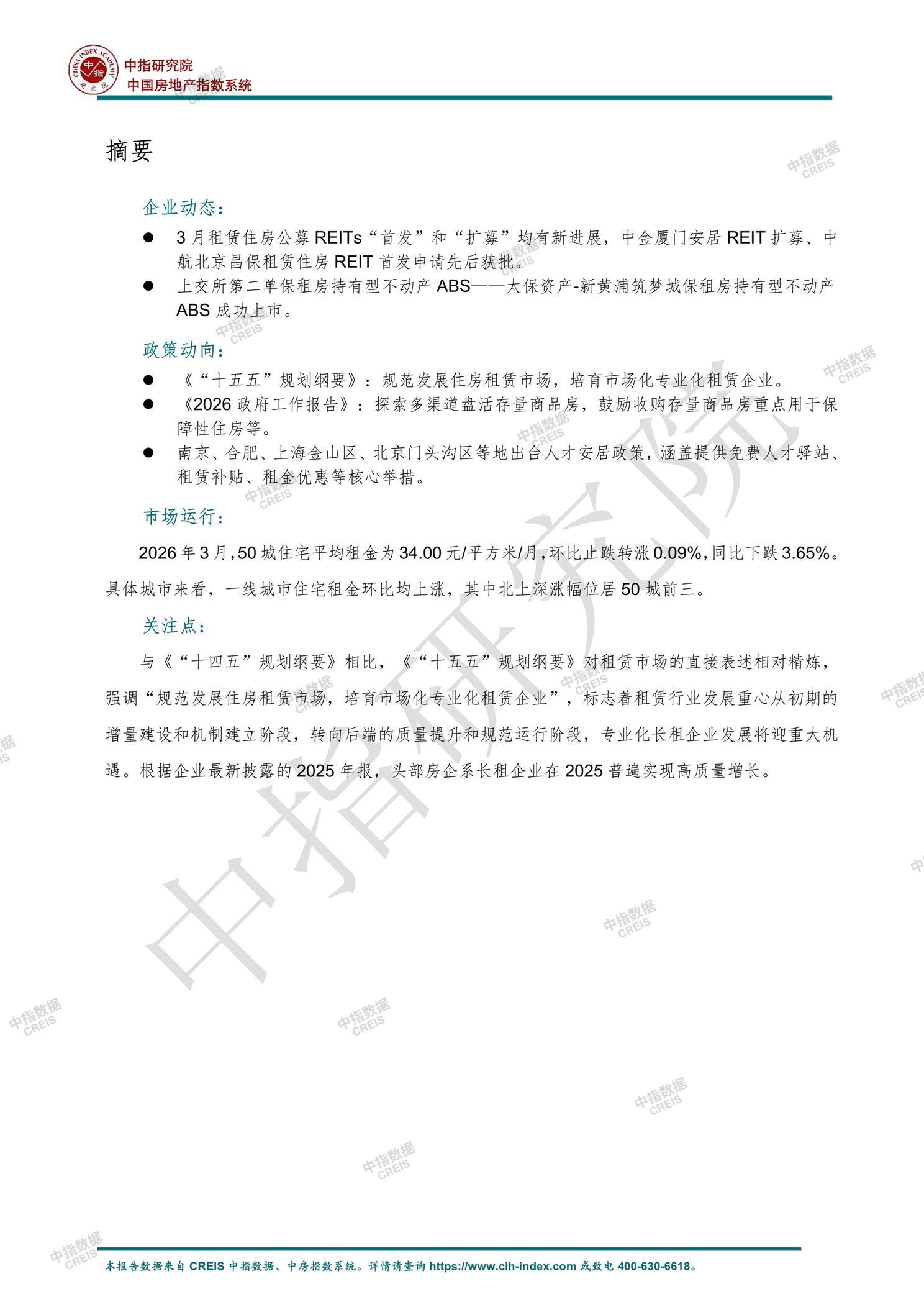 [摘要] 2026年3月中国住房租赁市场呈现以下特点:政策层面,《“十五五”规划纲要》提出规范发展住房租赁市场,培育市场化专业化租赁企业;南京、合肥、上海金山区、北京门头沟区等地出台人才安居政策。市场运行上,50城住宅平均租金为34.00元/平方米/月,环比止跌转涨0.09%,同比下跌3.65%。具体城市来看,一线城市住宅租金环比均上涨,其中北上深涨幅位居50城前三。