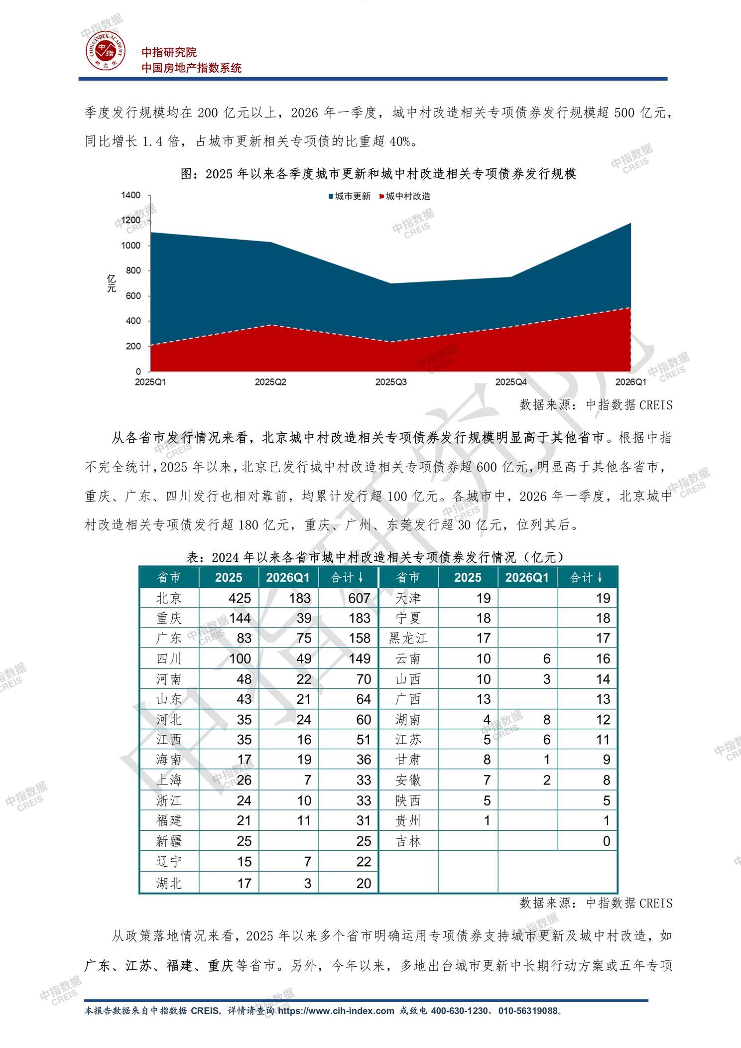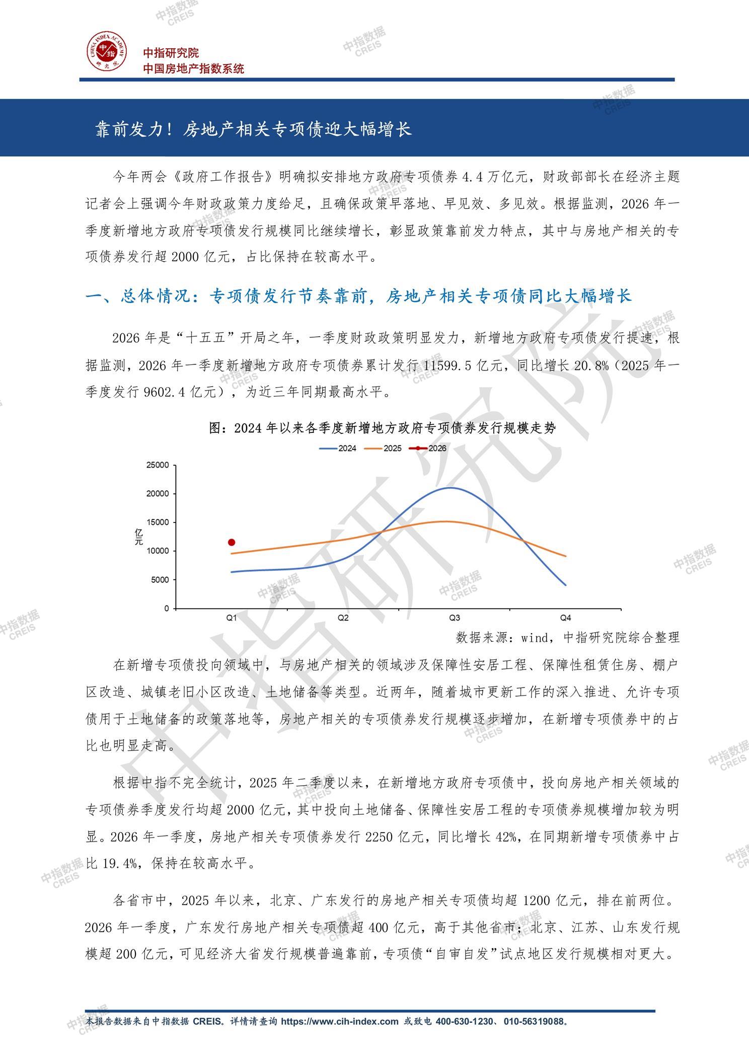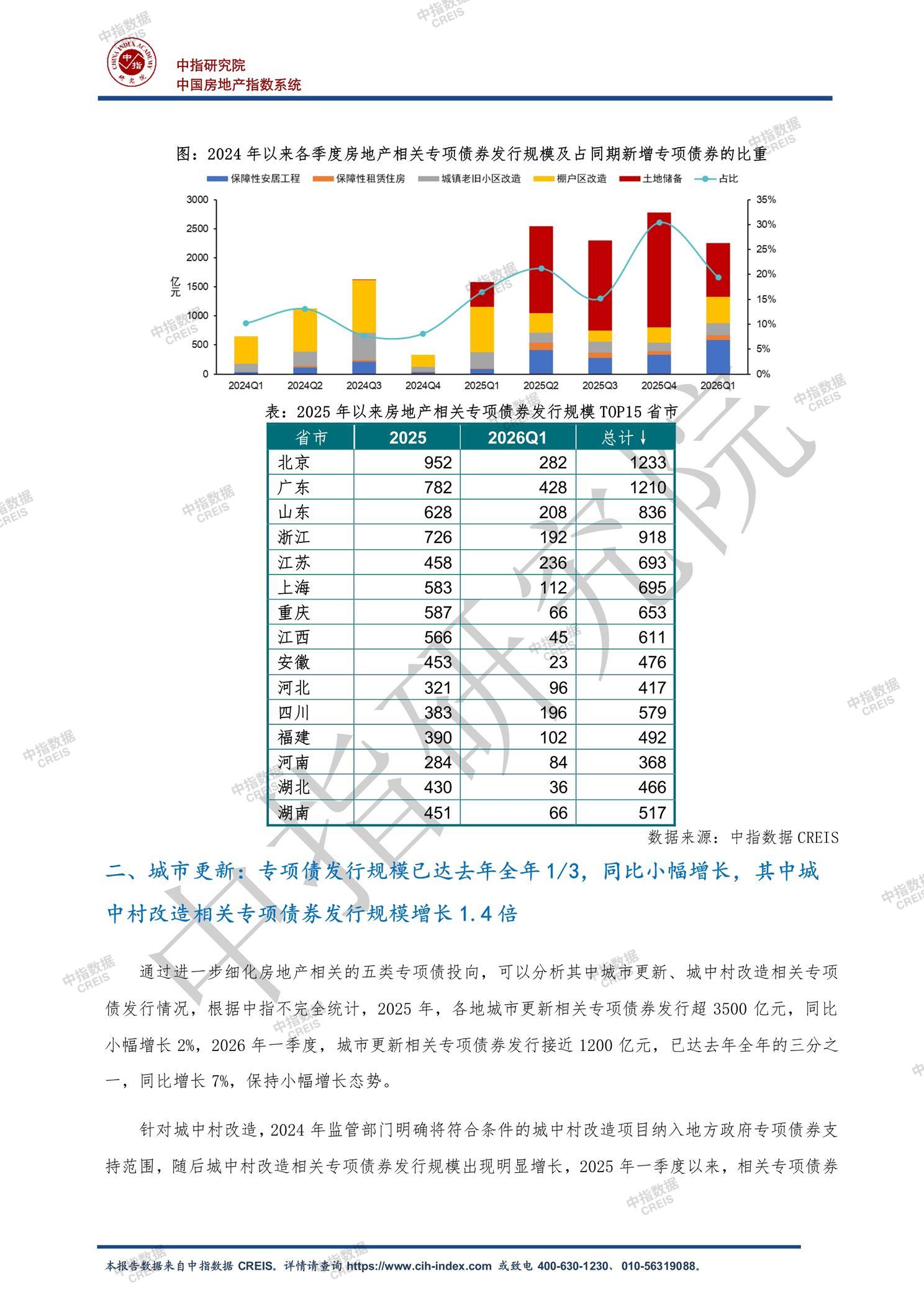 [摘要] 2026年一季度地方政府专项债发行呈现靠前发力特点,新增专项债规模达11599.5亿元,同比增长20.8%,其中房地产相关专项债发行2250亿元,占比19.4%,同比增长42%。主要投向保障性安居工程、土地储备等领域,北京、广东等经济大省发行规模领先。城市更新专项债发行接近1200亿元,占去年全年的三分之一,城中村改造专项债同比增长1.4倍至超500亿元。土地储备专项债发行918亿元,其中收回收购存量闲置土地占比超50%,拟收储总金额达7865亿元。收购存量商品房专项债发行规模偏低,累计仅超60亿元。多地政策支持专项债用于城市更新和房地产去库存,未来资金投放将侧重效益高的地区。 【此内容为AI自动生成】