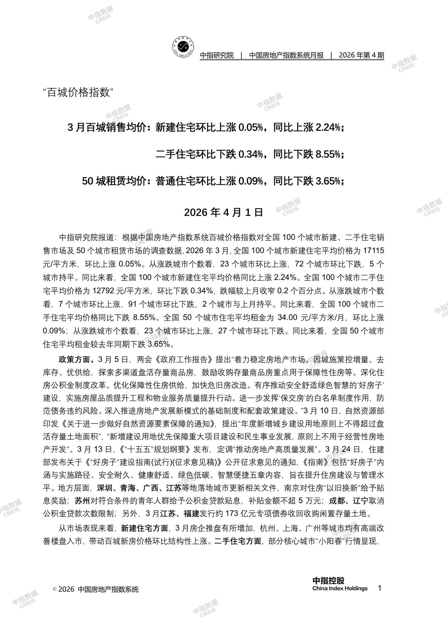 [摘要] 2026年3月中国房地产市场呈现分化态势。新建住宅方面,百城均价环比微涨0.05%至17115元/平方米,23城上涨72城下跌;二手住宅均价环比下跌0.34%至12792元/平方米,同比跌幅达8.55%。租赁市场受返工潮带动,50城住宅租金环比上涨0.09%。政策层面强调"稳定房地产市场",各地因城施策推进去库存、优化供给,并加快"好房子"建设。市场表现上,核心城市优质项目入市带动新房结构性上涨,二手房跌幅收窄,京沪显现"小阳春"行情。十大城市中杭州住宅指数环比上涨0.12%,其余多数下跌。整体看,市场仍处调整期,但核心城市呈现边际改善迹象。 【此内容为AI自动生成】