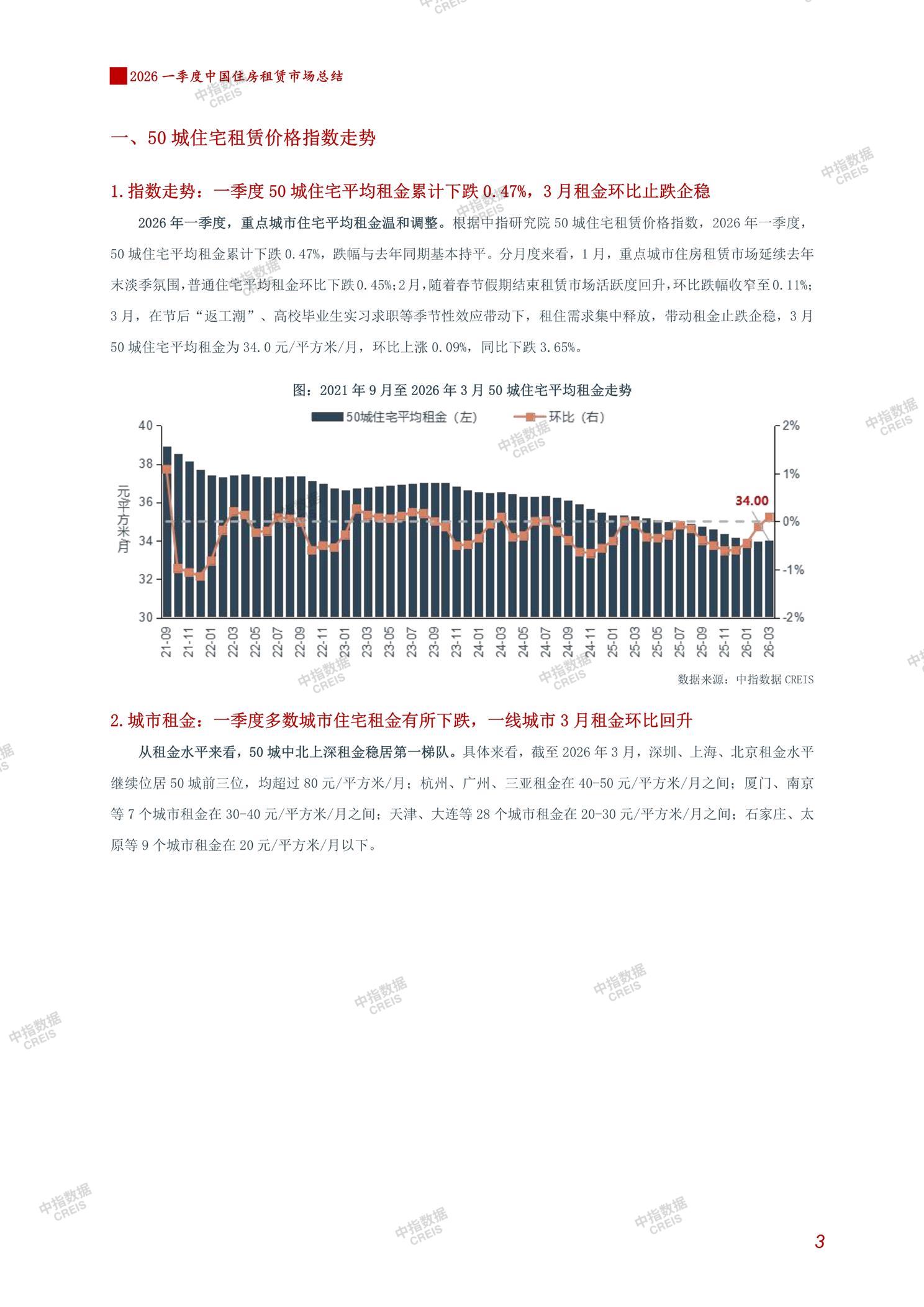 [摘要] 2026年一季度中国住房租赁市场呈现温和调整态势,50城住宅平均租金累计下跌0.47%,但3月受季节性需求带动环比止跌企稳。一线城市中深圳、上海、北京租金超80元/平方米/月,3月一线城市租金环比回升0.34%。政策层面,“十五五”规划强调规范发展租赁市场,培育专业化企业,地方政策通过存量盘活和多渠道供给优化房源。保租房REITs表现稳健,底层资产出租率保持90%以上,一季度新增首发与扩募项目,市场化退出渠道逐步完善。企业规模方面,TOP30集中式长租公寓开业和管理房源分别达146万间和205万间,房企系和地方国企系主导市场。长期来看,行业将向合规化、品质化和资本化方向发展。 【此内容为AI自动生成】