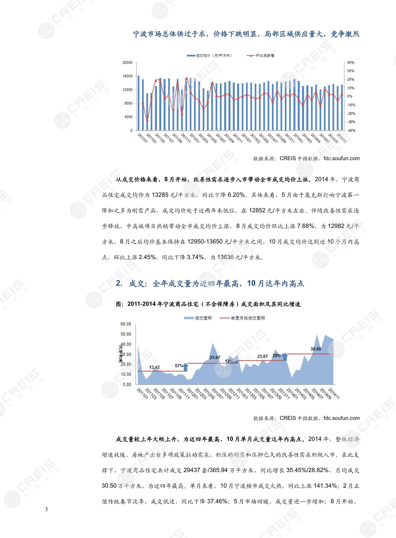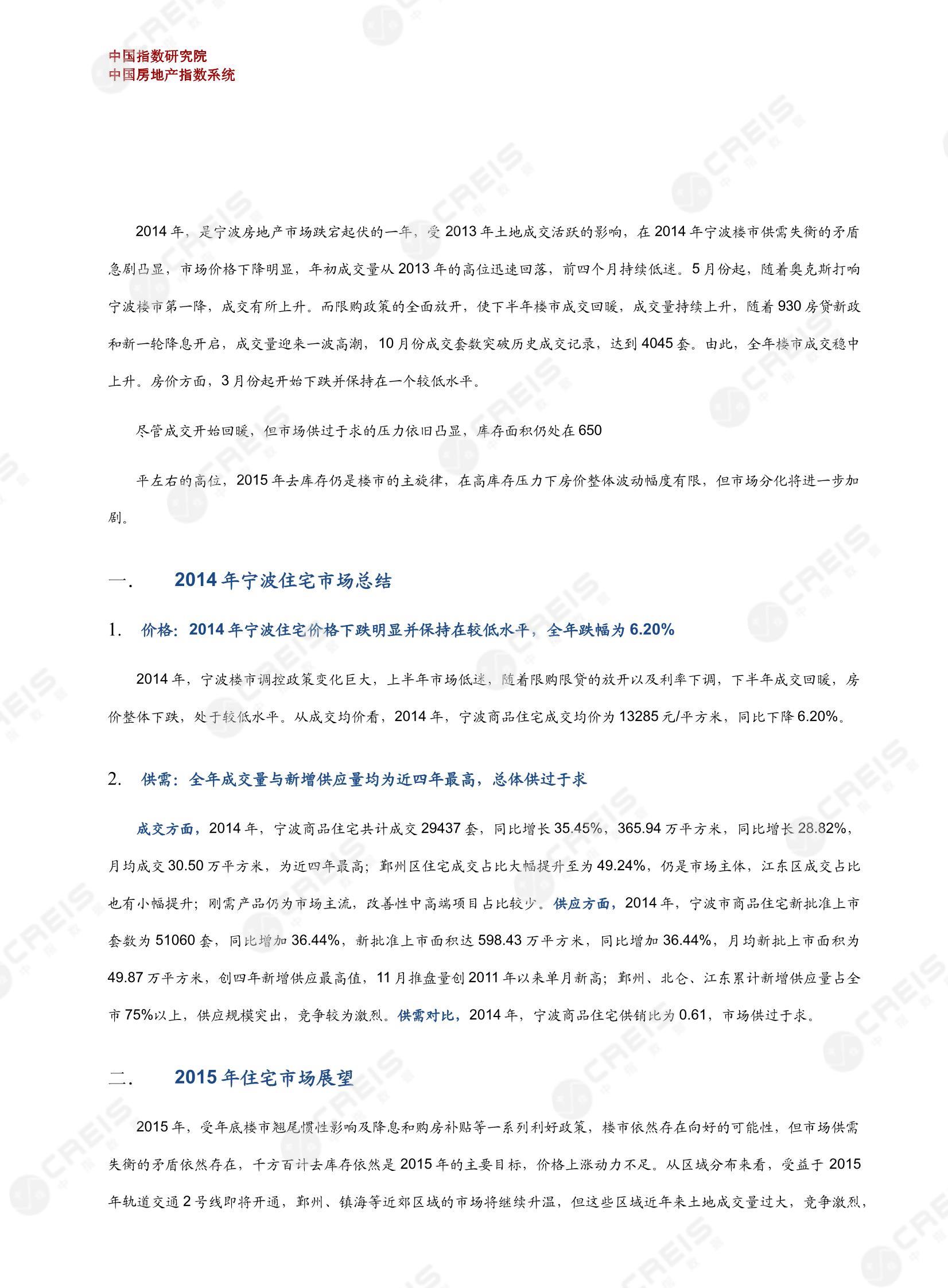 [摘要] 2014年,是宁波房地产市场跌宕起伏的一年,受2013年土地成交活跃的影响,在2014年宁波楼市供需失衡的矛盾急剧凸显,市场价格下降明显,年初成交量从2013年的高位迅速回落,前四个月持续低迷。5月份起,随着奥克斯打响宁波楼市第一降,成交有所上升。而限购政策的全面放开,使下半年楼市成交回暖,成交量持续上升,随着930房贷新政和新一轮降息开启,成交量迎来一波高潮,10月份成交套数突破历史成交记录,达到4045套。由此,全年楼市成交稳中上升。房价方面,3月份起开始下跌并保持在一个较低水平。 尽管成交开始回暖,但市场供过于求的压力依旧凸显,库存面积仍处在650万平左右的高位,2015年去库存仍是楼市的主旋律,在高库存压力下房价整体波动幅度有限,但市场分化将进一步加剧。