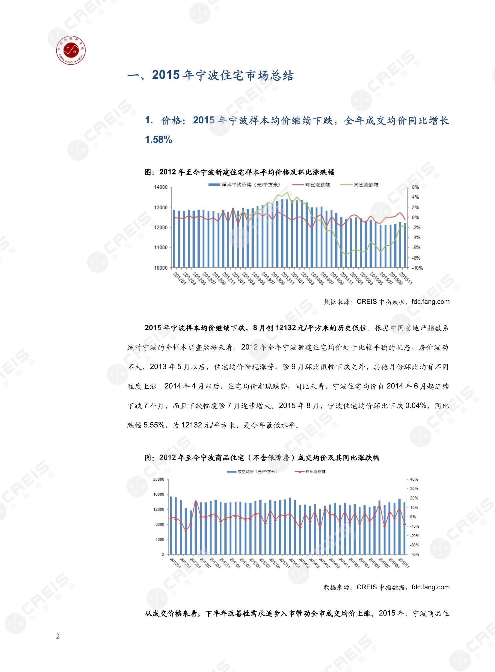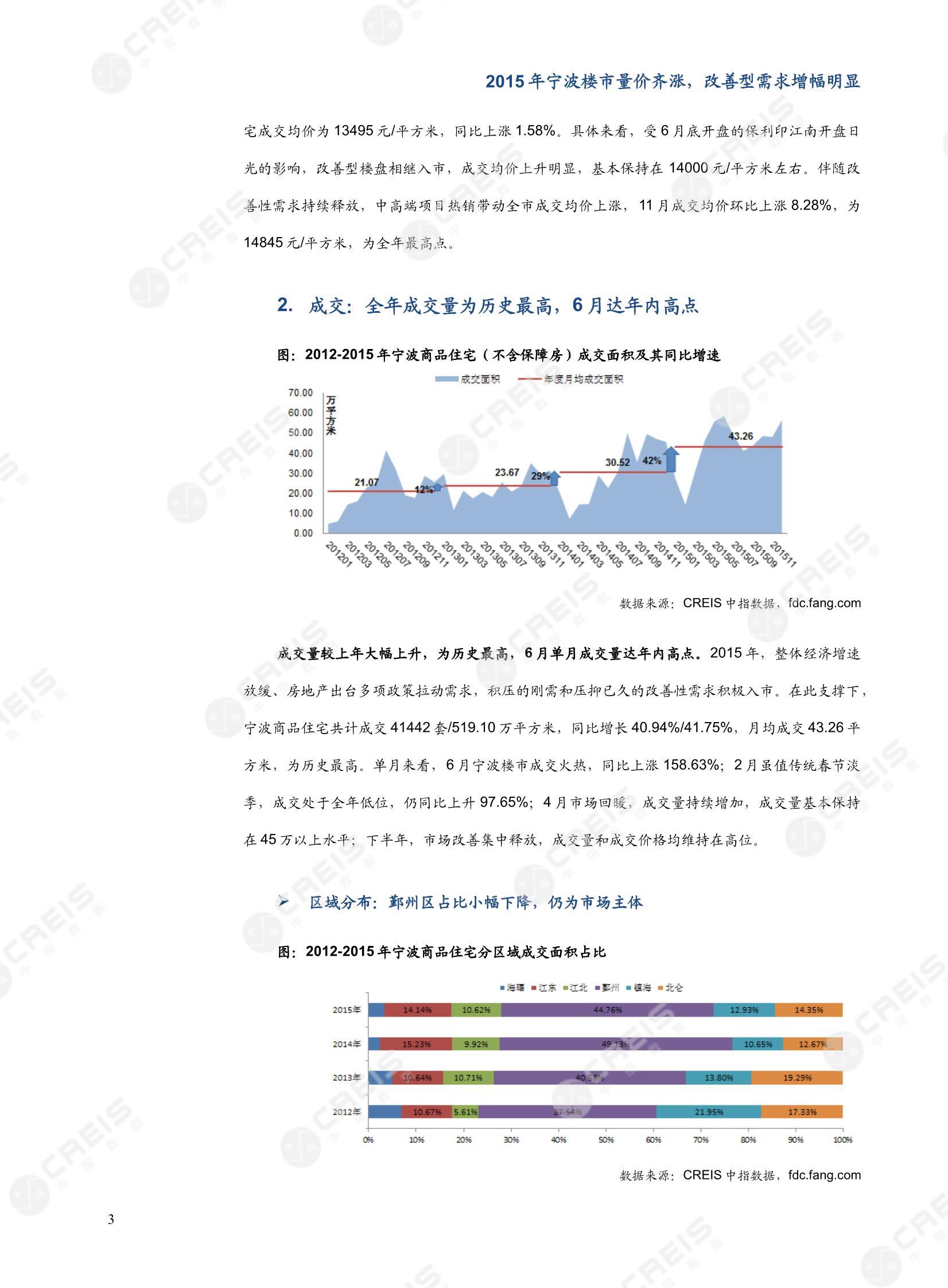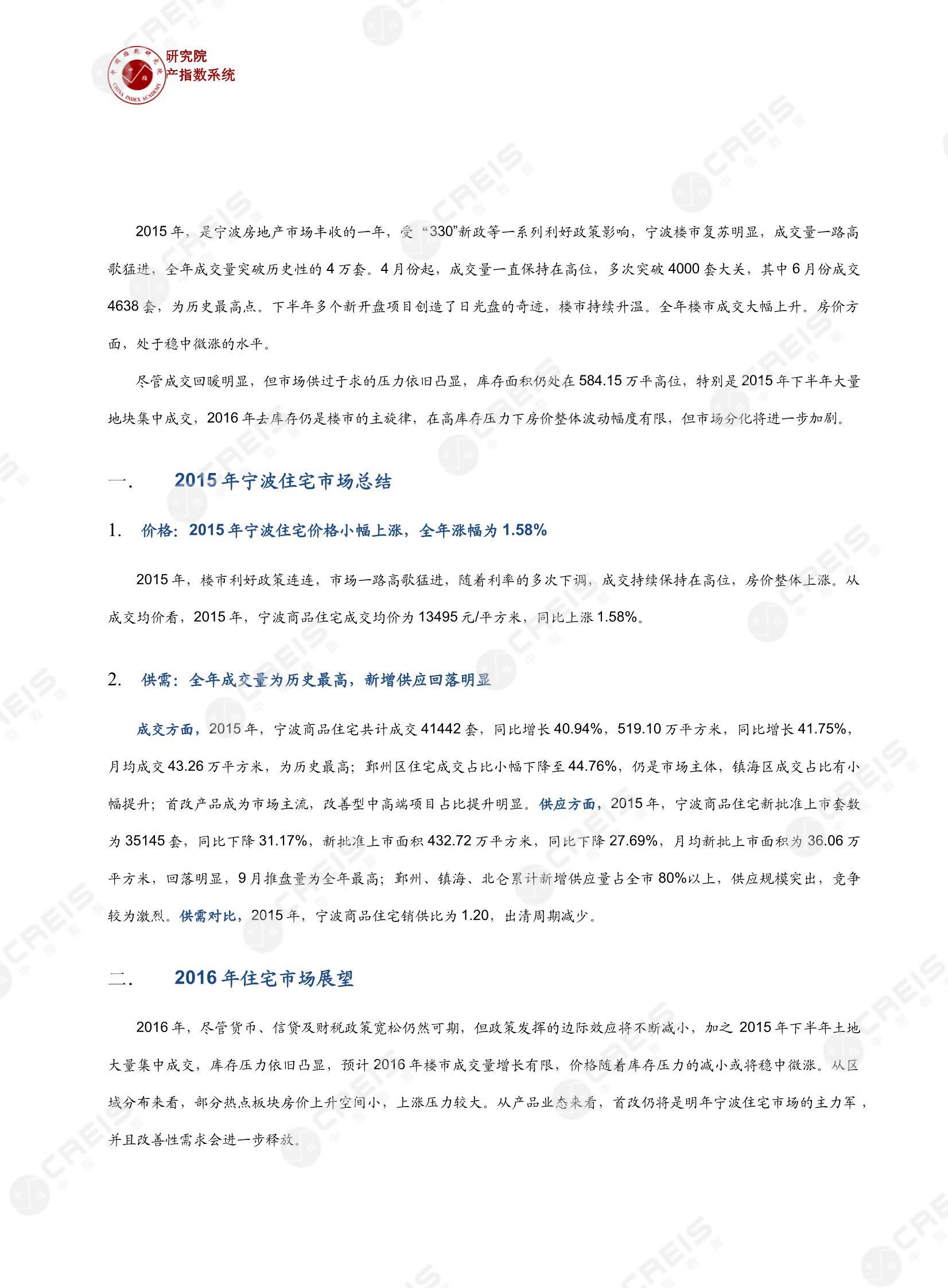 [摘要] 2015年,是宁波房地产市场丰收的一年,受“330”新政等一系列利好政策影响,宁波楼市复苏明显,成交量一路高歌猛进,全年成交量突破历史性的4万套。4月份起,成交量一直保持在高位,多次突破4000套大关,其中6月份成交4638套,为历史最高点。下半年多个新开盘项目创造了日光盘的奇迹,楼市持续升温。全年楼市成交大幅上升。房价方面,处于稳中微涨的水平。 尽管成交回暖明显,但市场供过于求的压力依旧凸显,库存面积仍处在584.15万平高位,特别是2015年下半年大量地块集中成交,2016年去库存仍是楼市的主旋律,在高库存压力下房价整体波动幅度有限,但市场分化将进一步加剧。