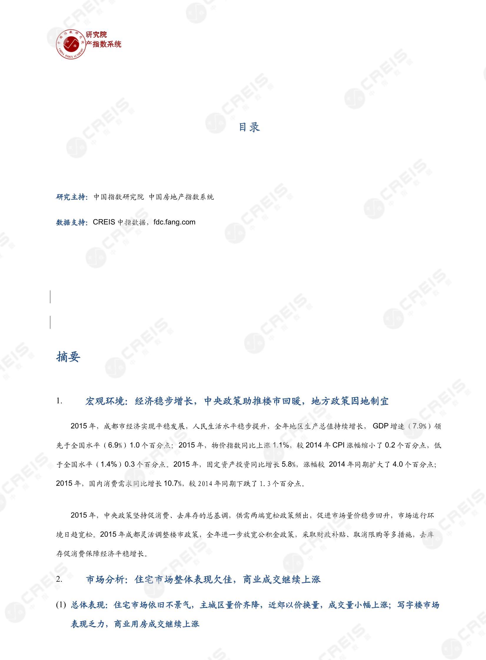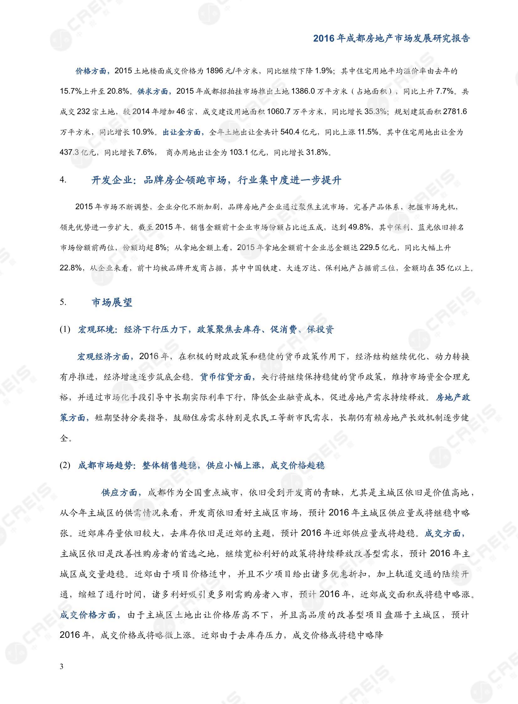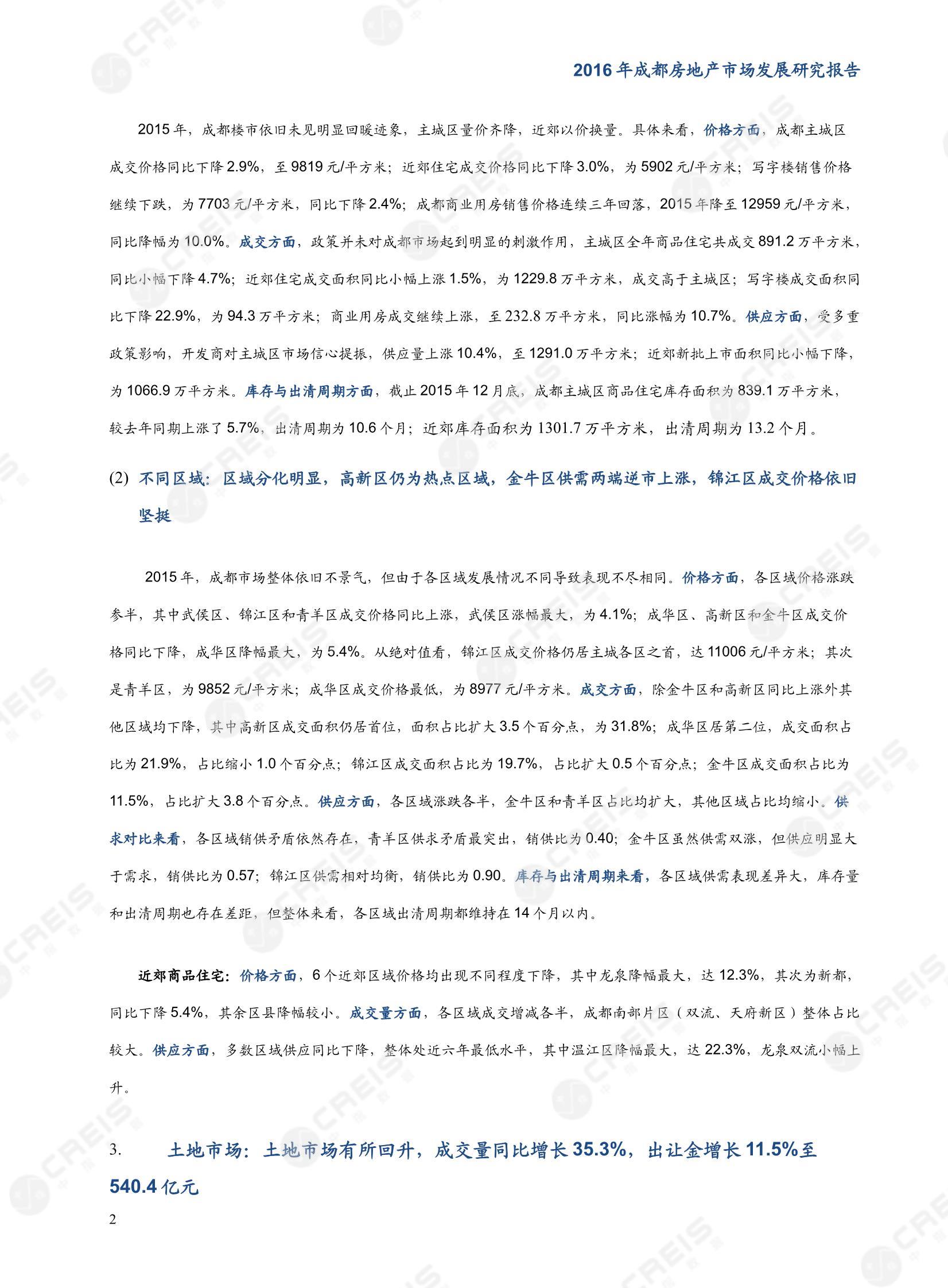 [摘要] 一、 宏观环境:经济稳步增长,中央政策助推楼市回暖,地方政策因地制宜 2015年,成都市经济实现平稳发展,人民生活水平稳步提升,全年地区生产总值持续增长,GDP增速(7.9%)领先于全国水平(6.9%)1.0个百分点;2015年,物价指数同比上涨1.1%,较2014年CPI涨幅缩小了0.2个百分点,低于全国水平(1.4%)0.3个百分点。2015年,固定资产投资同比增长5.8%,涨幅较 2014年同期扩大了4.0个百分点;2015年,国内消费需求同比增长10.7%,较2014年同期下跌了1.3个百分点。 2015年,中央政策坚持促消费、去库存的总基调,供需两端宽松政策频出,促进市场量价稳步回升,市场运行环境日趋宽松。2015年成都灵活调整楼市政策,全年进一步放宽公积金政策,采取财政补贴、取消限购等多措施,去库存促消费保障经济平稳增长。 二、 市场分析:住宅市场整体表现欠佳,商业成交继续上涨 (1) 总体表现:住宅市场依旧不景气,主城区量价齐降,近郊以价换量,成交量小幅上涨;写字楼市场表现乏力,商业用房成交继续上涨 2015年,成都楼市依旧未见明显回暖迹象,主城区量价齐降,近郊以价换量。具体来看,价格方面,成都主城区成交价格同比下降2.9%,至9819元/平方米;近郊住宅成交价格同比下降3.0%,为5902元/平方米;写字楼销售价格继续下跌,为7703元/平方米,同比下降2.4%;成都商业用房销售价格连续三年回落,2015年降至12959元/平方米,同比降幅为10.0%。成交方面,政策并未对成都市场起到明显的刺激作用,主城区全年商品住宅共成交891.2万平方米,同比小幅下降4.7%;近郊住宅成交面积同比小幅上涨1.5%,为1229.8万平方米,成交高于主城区;写字楼成交面积同比下降22.9%,为94.3万平方米;商业用房成交继续上涨,至232.8万平方米,同比涨幅为10.7%。供应方面,受多重政策影响,开发商对主城区市场信心提振,供应量上涨10.4%,至1291.0万平方米;近郊新批上市面积同比小幅下降,为1066.9万平方米。库存与出清周期方面,截止2015年12月底,成都主城区商品住宅库存面积为839.1万平方米,较去年同期上涨了5.7%,出清周期为10.6个月;近郊库存面积为1301.7万平方米,出清周期为13.2个月。 (2) 不同区域:区域分化明显,高新区仍为热点区域,金牛区供需两端逆市上涨,锦江区成交价格依旧坚挺 2015年,成都市场整体依旧不景气,但由于各区域发展情况不同导致表现不尽相同。价格方面,各区域价格涨跌参半,其中武侯区、锦江区和青羊区成交价格同比上涨,武侯区涨幅最大,为4.1%;成华区、高新区和金牛区成交价格同比下降,成华区降幅最大,为5.4%。从绝对值看,锦江区成交价格仍居主城各区之首,达11006元/平方米;其次是青羊区,为9852元/平方米;成华区成交价格最低,为8977元/平方米。成交方面,除金牛区和高新区同比上涨外其他区域均下降,其中高新区成交面积仍居首位,面积占比扩大3.5个百分点,为31.8%;成华区居第二位,成交面积占比为21.9%,占比缩小1.0个百分点;锦江区成交面积占比为19.7%,占比扩大0.5个百分点;金牛区成交面积占比为11.5%,占比扩大3.8个百分点。供应方面,各区域涨跌各半,金牛区和青羊区占比均扩大,其他区域占比均缩小。供求对比来看,各区域销供矛盾依然存在,青羊区供求矛盾最突出,销供比为0.40;金牛区虽然供需双涨,但供应明显大于需求,销供比为0.57;锦江区供需相对均衡,销供比为0.90。库存与出清周期来看,各区域供需表现差异大,库存量和出清周期也存在差距,但整体来看,各区域出清周期都维持在14个月以内。 近郊商品住宅:价格方面,6个近郊区域价格均出现不同程度下降,其中龙泉降幅最大,达12.3%,其次为新都,同比下降5.4%,其余区县降幅较小。成交量方面,各区域成交增减各半,成都南部片区(双流、天府新区)整体占比较大。供应方面,多数区域供应同比下降,整体处近六年最低水平,其中温江区降幅最大,达22.3%,龙泉双流小幅上升。 三、 土地市场:土地市场有所回升,成交量同比增长35.3%,出让金增长11.5%至540.4亿元 价格方面,2015土地楼面成交价格为1896元/平方米,同比继续下降1.9%;其中住宅用地平均溢价率由去年的15.7%上升至20.8%。供求方面,2015年成都招拍挂市场推出土地1386.0万平方米(占地面积),同比上升7.7%。共成交232宗土地,较2014年增加46宗,成交建设用地面积1060.7万平方米,同比增长35.3%;规划建筑面积2781.6万平方米,同比增长10.9%。出让金方面,全年土地出让金共计540.4亿元,同比上涨11.5%。其中住宅用地出让金为437.3亿元,同比增长7.6%, 商办用地出让金为103.1亿元,同比增长31.8%。 四、 开发企业:品牌房企领跑市场,行业集中度进一步提升 2015年市场不断调整,企业分化不断加剧,品牌房地产企业通过聚焦主流市场,完善产品体系,把握市场先机,领先优势进一步扩大。截至2015年,销售金额前十企业市场份额占比近五成,达到49.8%,其中保利、蓝光依旧排名市场份额前两位,份额均超8%;从拿地金额上看,2015年拿地金额前十企业总金额达229.5亿元,同比大幅上升22.8%,从企业来看,前十均被品牌开发商占据,其中中国铁建、大连万达、保利地产占据前三位,金额均在35亿以上。 五、 市场展望 (1) 宏观环境:经济下行压力下,政策聚焦去库存、促消费、保投资 宏观经济方面,2016年,在积极的财政政策和稳健的货币政策作用下,经济结构继续优化、动力转换有序推进,经济增速逐步筑底企稳。货币信贷方面,央行将继续保持稳健的货币政策,维持市场资金合理充裕,并通过市场化