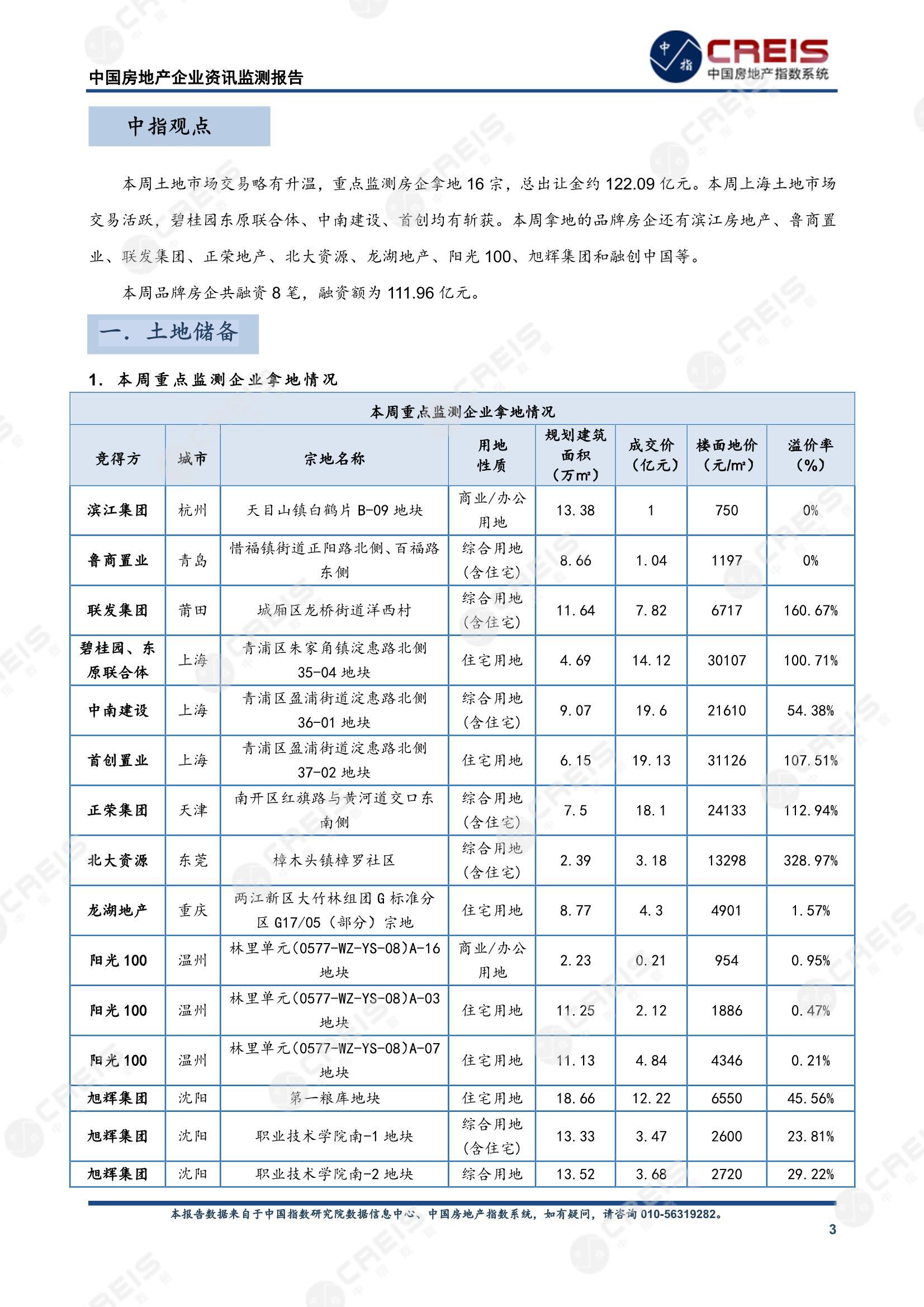 • [摘要] 本周土地市场交易略有升温,重点监测房企拿地16宗,总出让金约122.09亿元。本周上海土地市场交易活跃,碧桂园东原联合体、中南建设、首创均有斩获。本周拿地的品牌房企还有滨江房地产、鲁商置业、联发集团、正荣地产、北大资源、龙湖地产、阳光100、旭辉集团和融创中国等。 本周品牌房企共融资8笔,融资额为111.96亿元。