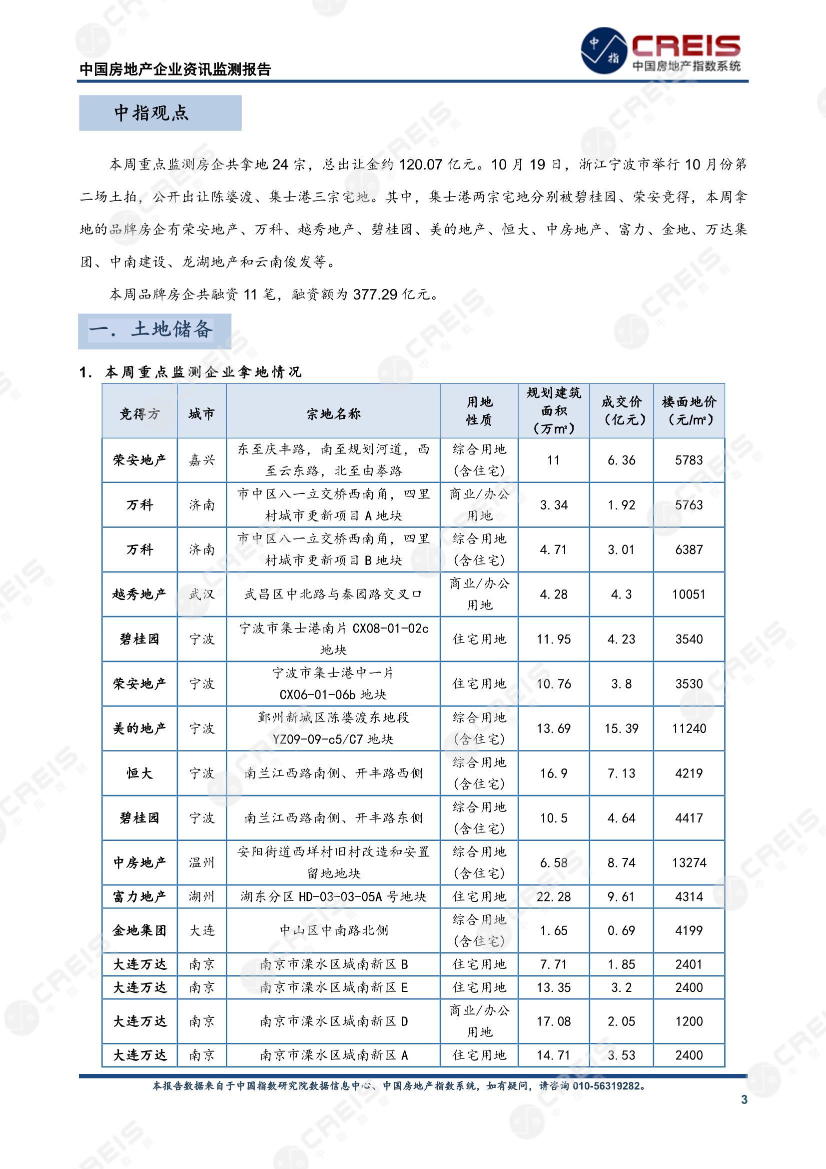• [摘要] 本周重点监测房企共拿地24宗,总出让金约120.07亿元。10月19日,浙江宁波市举行10月份第二场土拍,公开出让陈婆渡、集士港三宗宅地。其中,集士港两宗宅地分别被碧桂园、荣安竞得,本周拿地的品牌房企有荣安地产、万科、越秀地产、碧桂园、美的地产、恒大、中房地产、富力、金地、万达集团、中南建设、龙湖地产和云南俊发等。 本周品牌房企共融资11笔,融资额为377.29亿元。