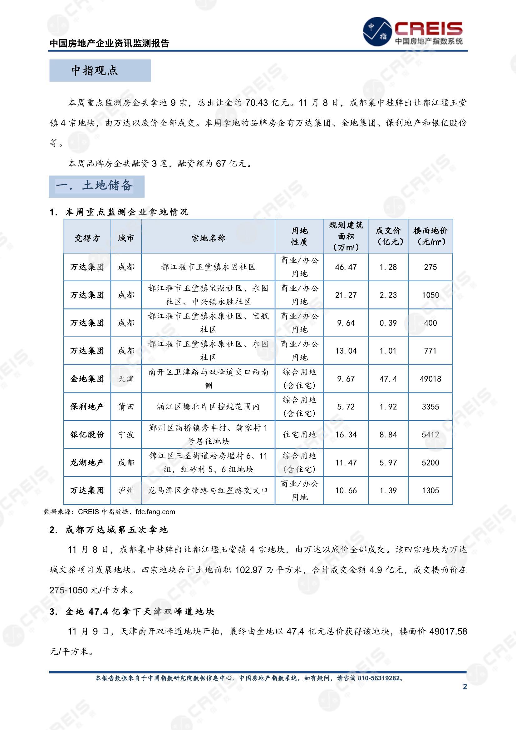 • [摘要] 本周重点监测房企共拿地9宗,总出让金约70.43亿元。11月8日,成都集中挂牌出让都江堰玉堂镇4宗地块,由万达以底价全部成交。本周拿地的品牌房企有万达集团、金地集团、保利地产和银亿股份等。 本周品牌房企共融资3笔,融资额为67亿元。