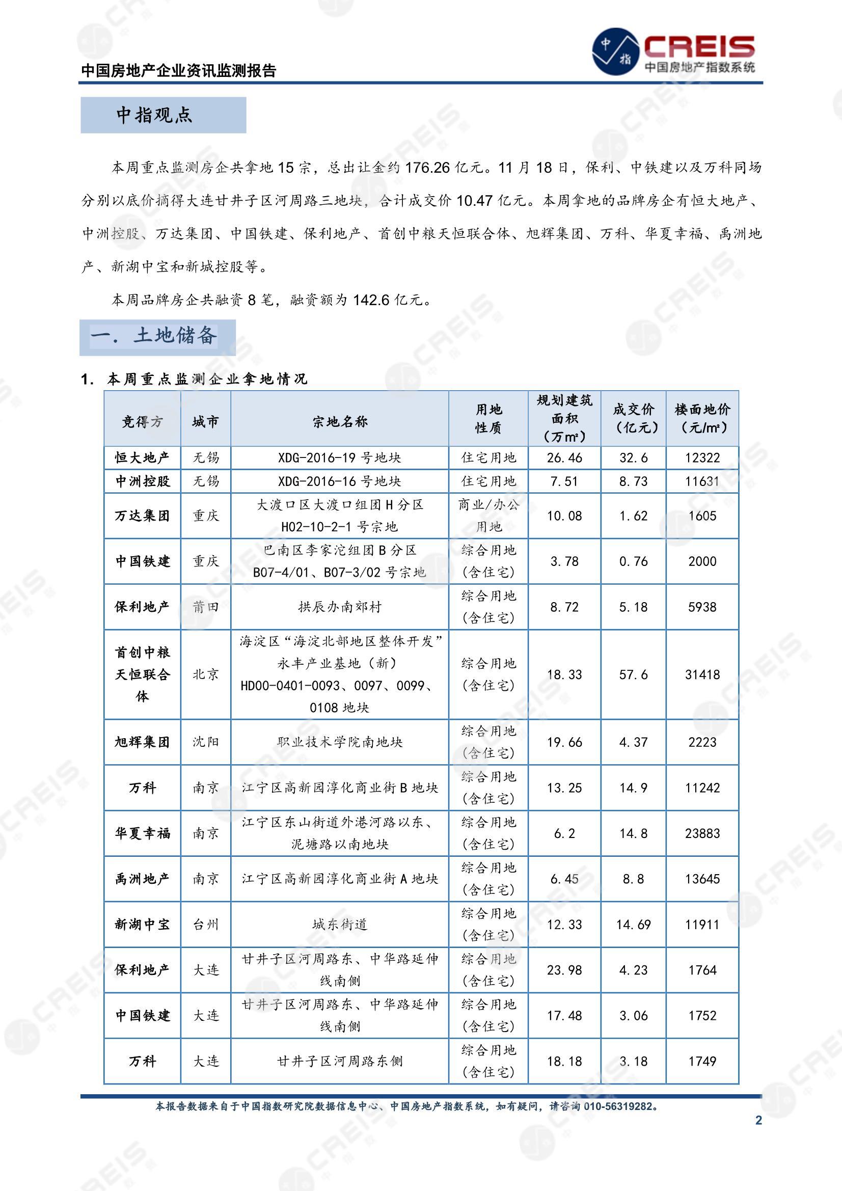 • [摘要] 本周重点监测房企共拿地15宗,总出让金约176.26亿元。11月18日,保利、中铁建以及万科同场分别以底价摘得大连甘井子区河周路三地块,合计成交价10.47亿元。本周拿地的品牌房企有恒大地产、中洲控股、万达集团、中国铁建、保利地产、首创中粮天恒联合体、旭辉集团、万科、华夏幸福、禹洲地产、新湖中宝和新城控股等。 本周品牌房企共融资8笔,融资额为142.6亿元。