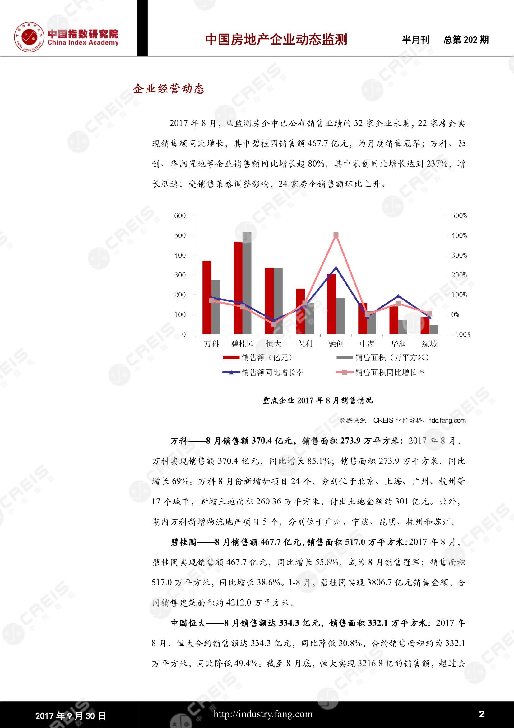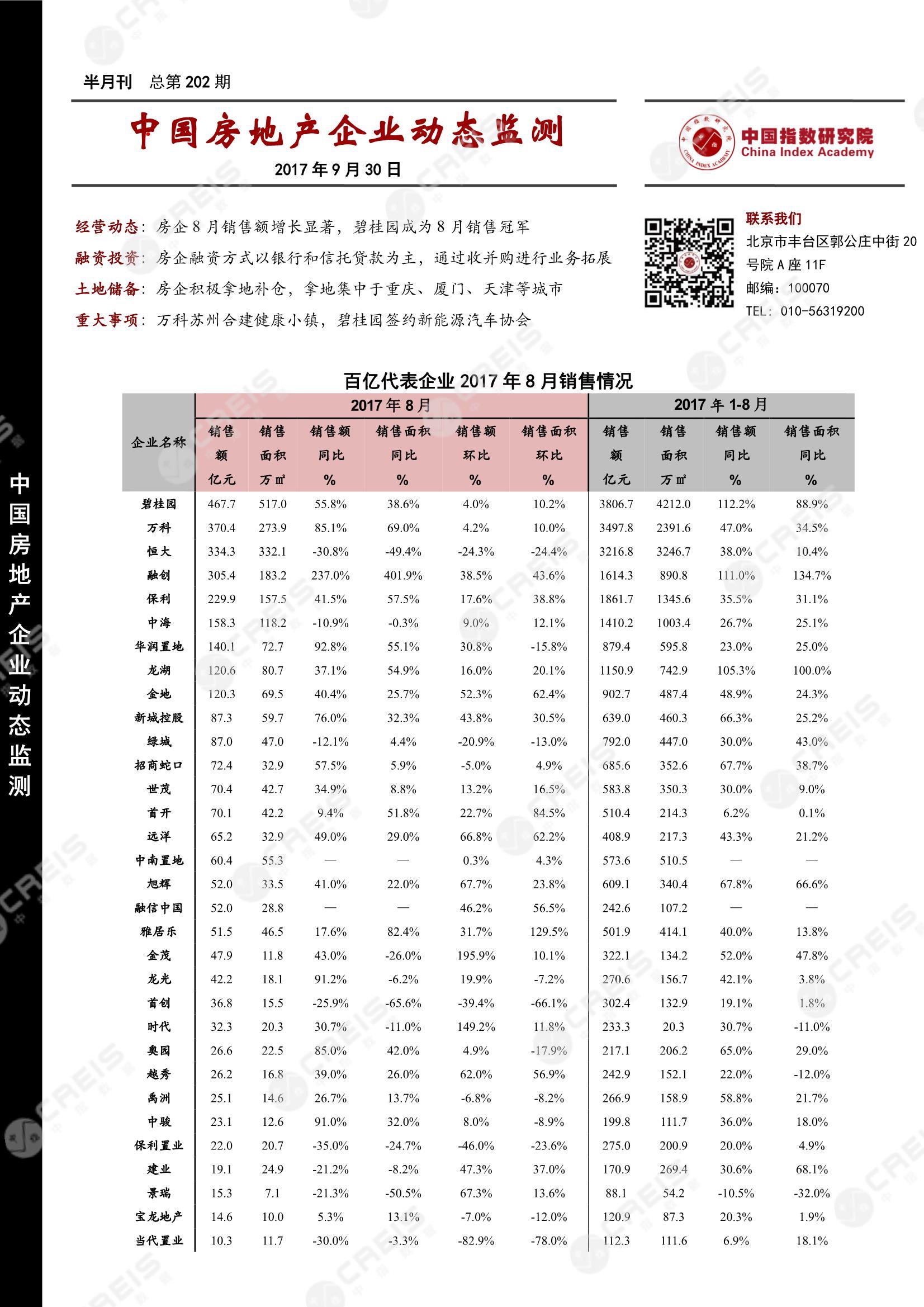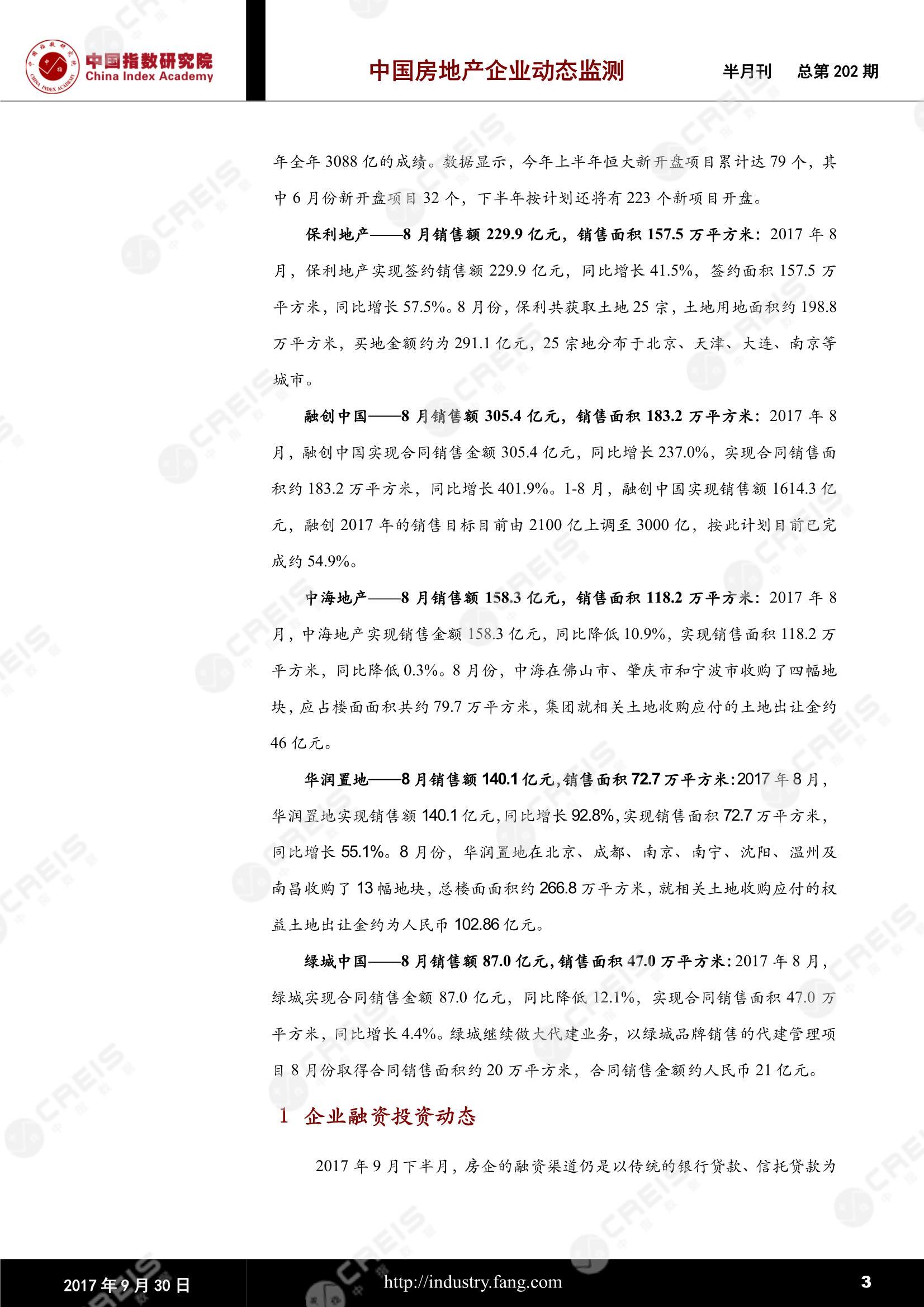 • [摘要] 经营动态:房企8月销售额增长显著,碧桂园成为8月销售冠军 融资投资:房企融资方式以银行和信托贷款为主,通过收并购进行业务拓展 土地储备:房企积极拿地补仓,拿地集中于重庆、厦门、天津等城市 重大事项:万科苏州合建健康小镇,碧桂园签约新能源汽车协会