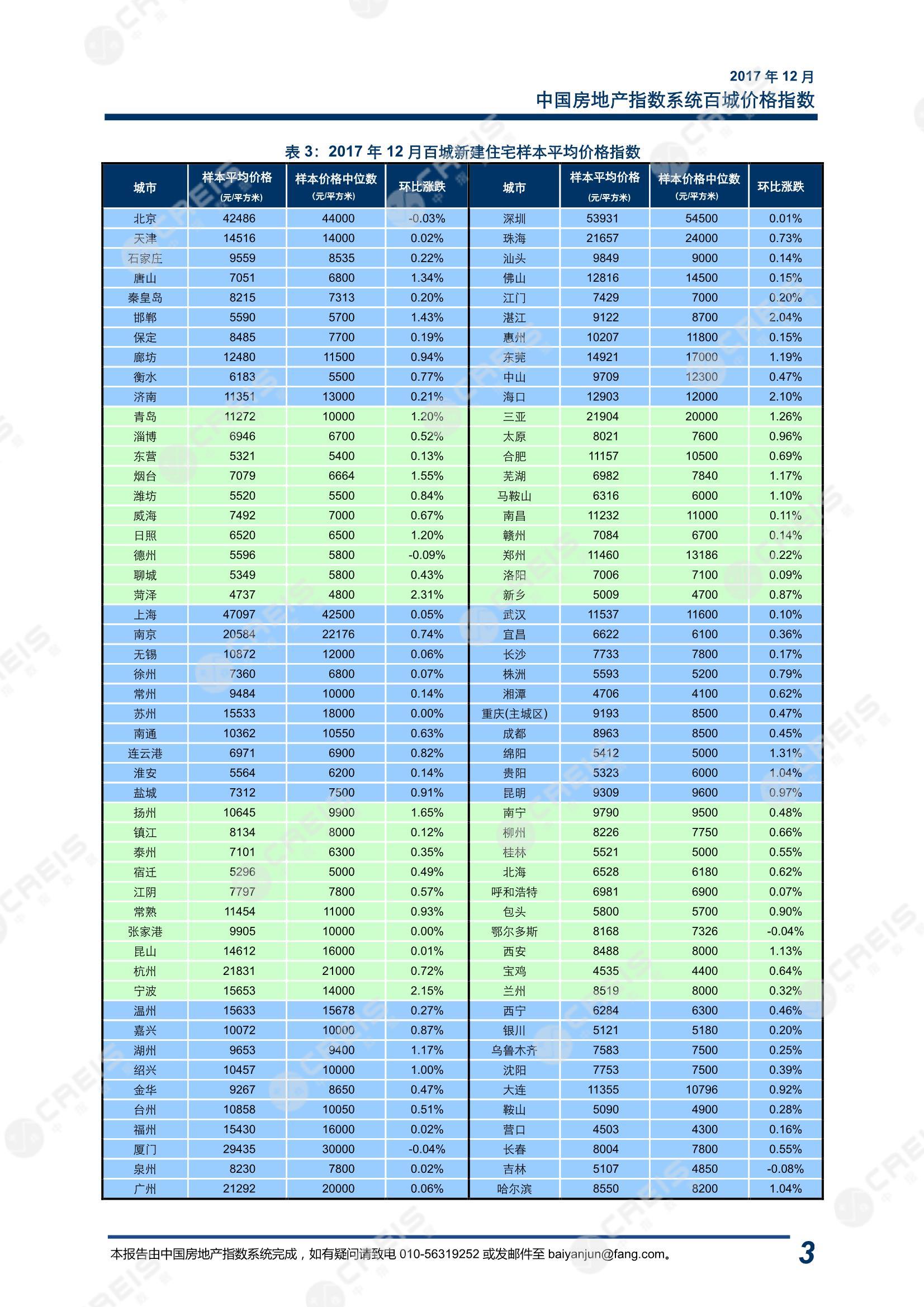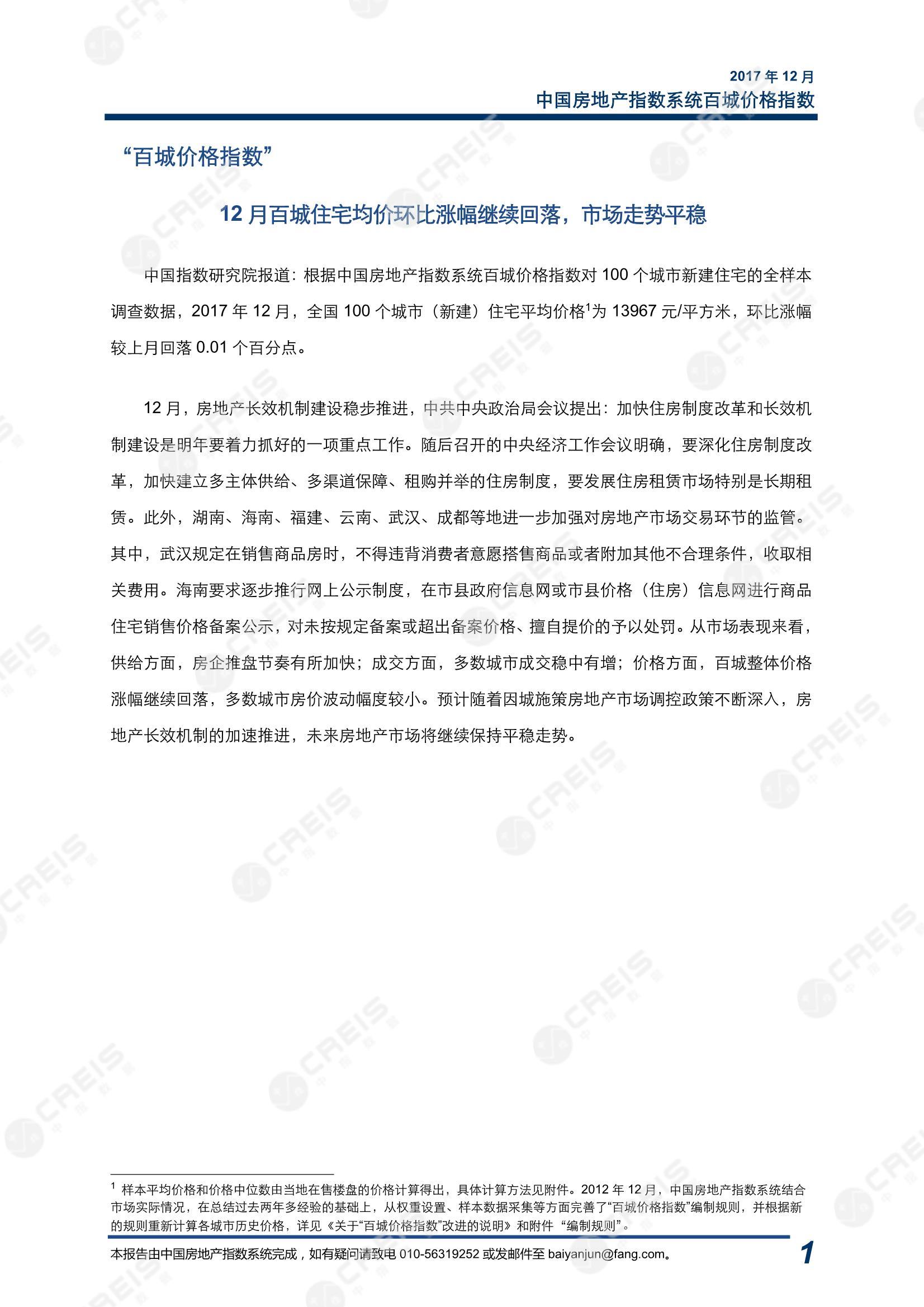 • [摘要] 中国指数研究院报道:根据中国房地产指数系统百城价格指数对 100 个城市新建住宅的全样本调查数据,2017 年 12 月,全国 100 个城市(新建)住宅平均价格为 13967 元/平方米,环比涨幅较上月回落 0.01 个百分点。