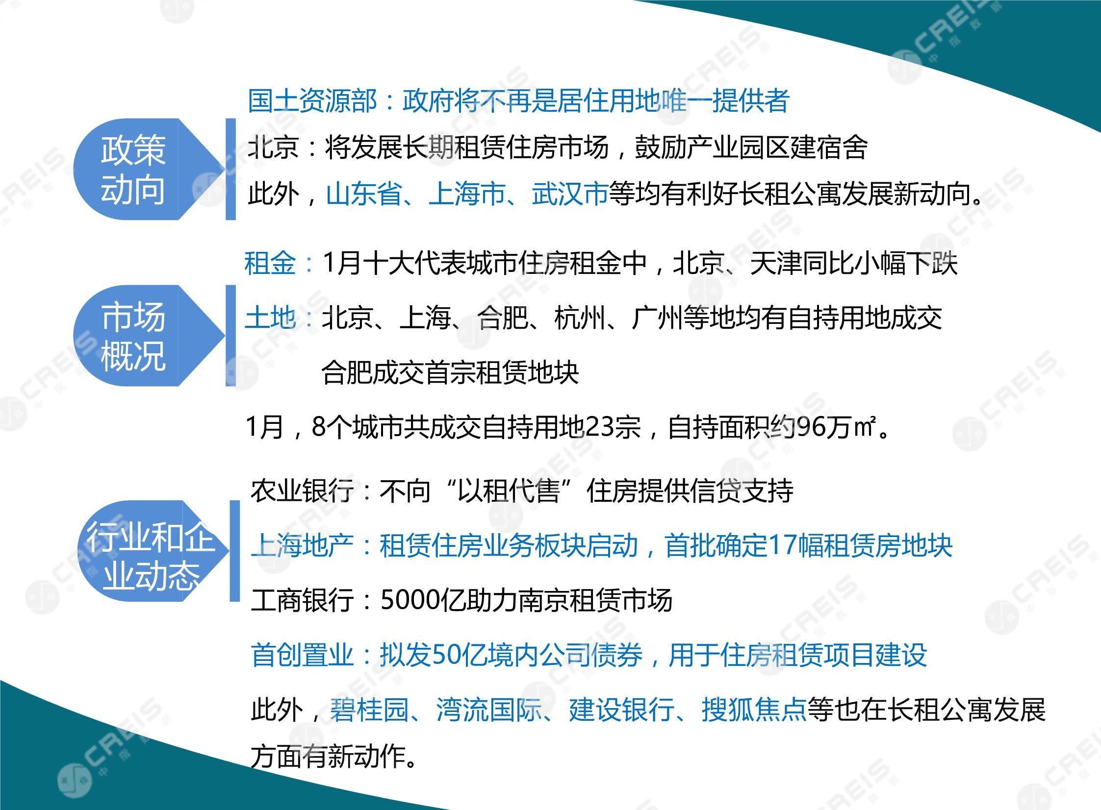 [摘要] 本月,继北京、上海先期试点后,11个城市集体建设用地建租赁房试点方案获批,标志第一批13个试点城市全部进入实施阶段;国土资源部表示,政府不再是居住用地唯一提供者,将有助于盘活集体建设用地,长租公寓利好政策频发;土地推地力度加大,成交自持面积近百万平方米,创单月历史新高,上海成交8宗租赁用地;金融机构继续发力对长租市场提供金融支持,企业布局项目加速落地。2018年首月,长租公寓市场延续去年的发展势头,实操性动作频繁,市场表现不一般。
