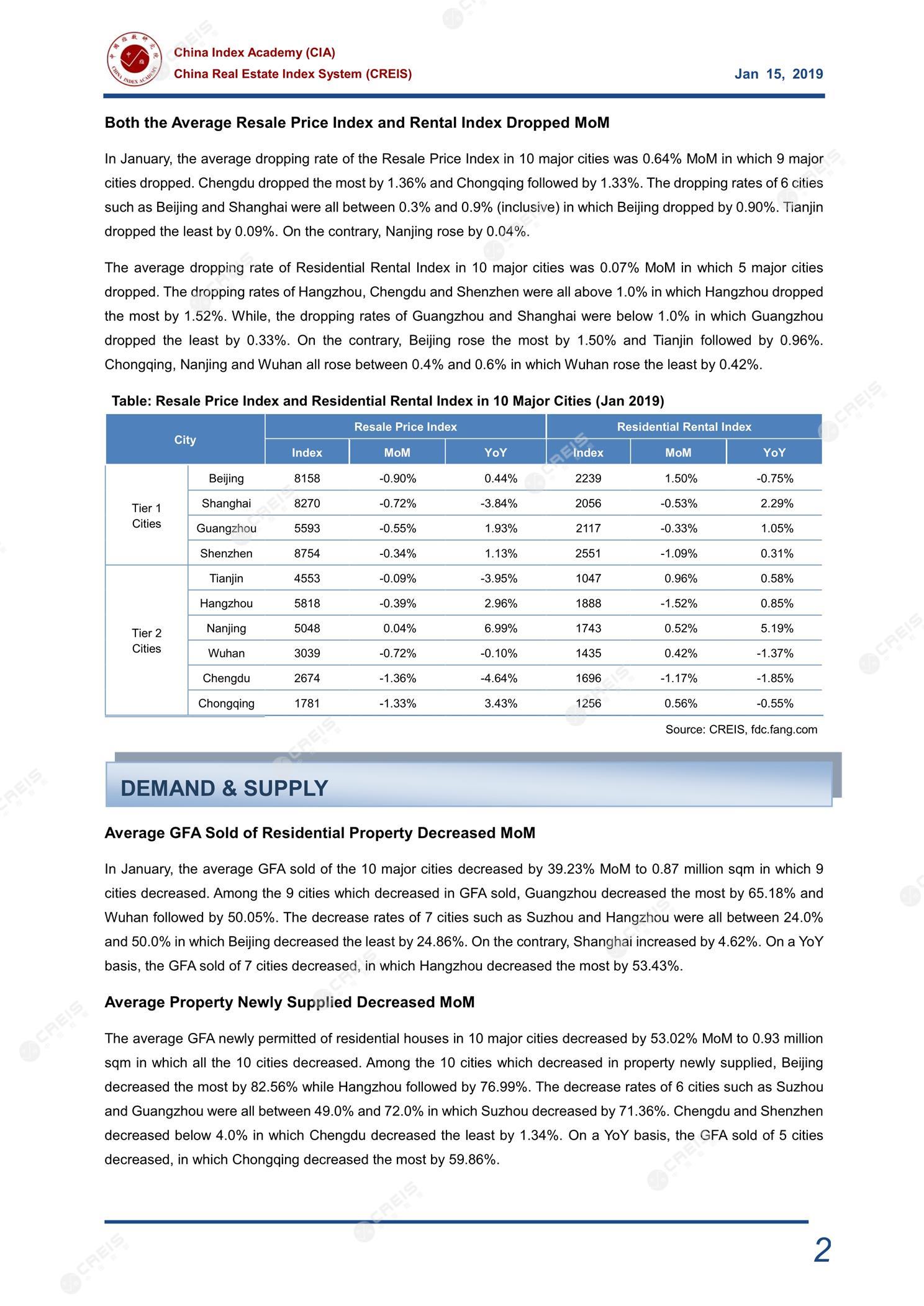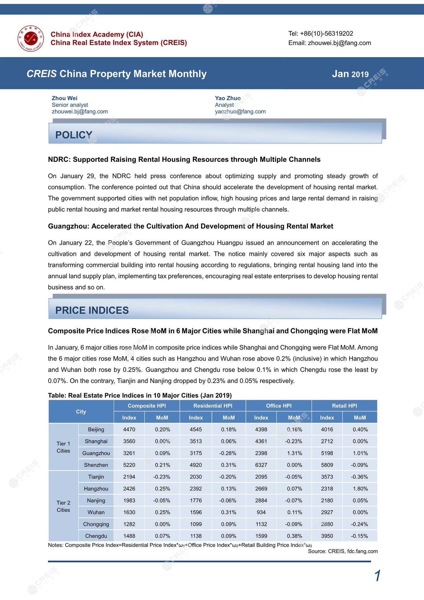 [摘要] In January, 6 major cities rose MoM in composite price indices while Shanghai and Chongqing were Flat MoM. Among the 6 major cities rose MoM, 4 cities such as Hangzhou and Wuhan rose above 0.2% (inclusive) in which Hangzhou and Wuhan both rose by 0.25%. Guangzhou and Chengdu rose below 0.1% in which Chengdu rose the least by 0.07%. On the contrary, Tianjin and Nanjing dropped by 0.23% and 0.05% respectively.