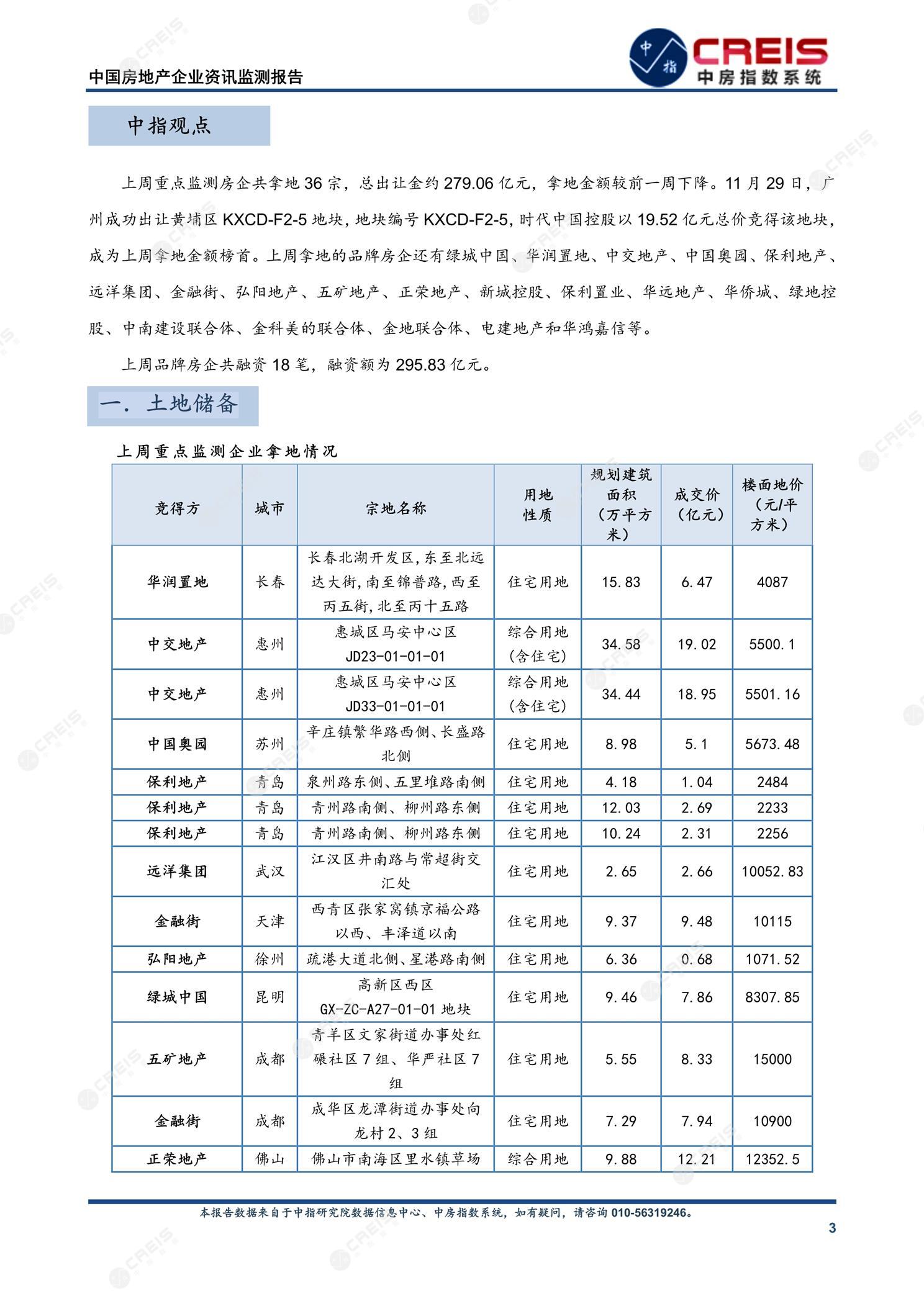 [摘要] 上周重点监测房企共拿地36宗,总出让金约279.06亿元,拿地金额较前一周下降。11月29日,广州成功出让黄埔区KXCD-F2-5地块,地块编号KXCD-F2-5,时代中国控股以19.52亿元总价竞得该地块,成为上周拿地金额榜首。上周拿地的品牌房企还有绿城中国、华润置地、中交地产、中国奥园、保利地产、远洋集团、金融街、弘阳地产、五矿地产、正荣地产、新城控股、保利置业、华远地产、华侨城、绿地控股、中南建设联合体、金科美的联合体、金地联合体、电建地产和华鸿嘉信等。 上周品牌房企共融资18笔,融资额为295.83亿元。