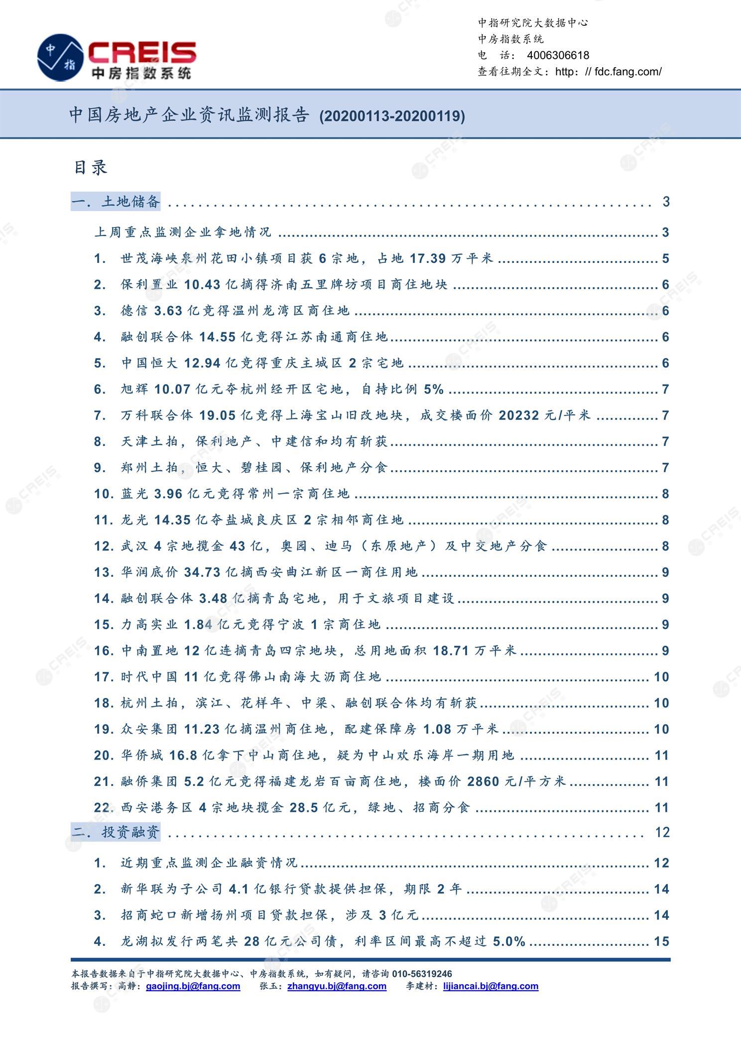 《中国房地产企业资讯监测报告(2020年1月13日-2020年1月19日)》