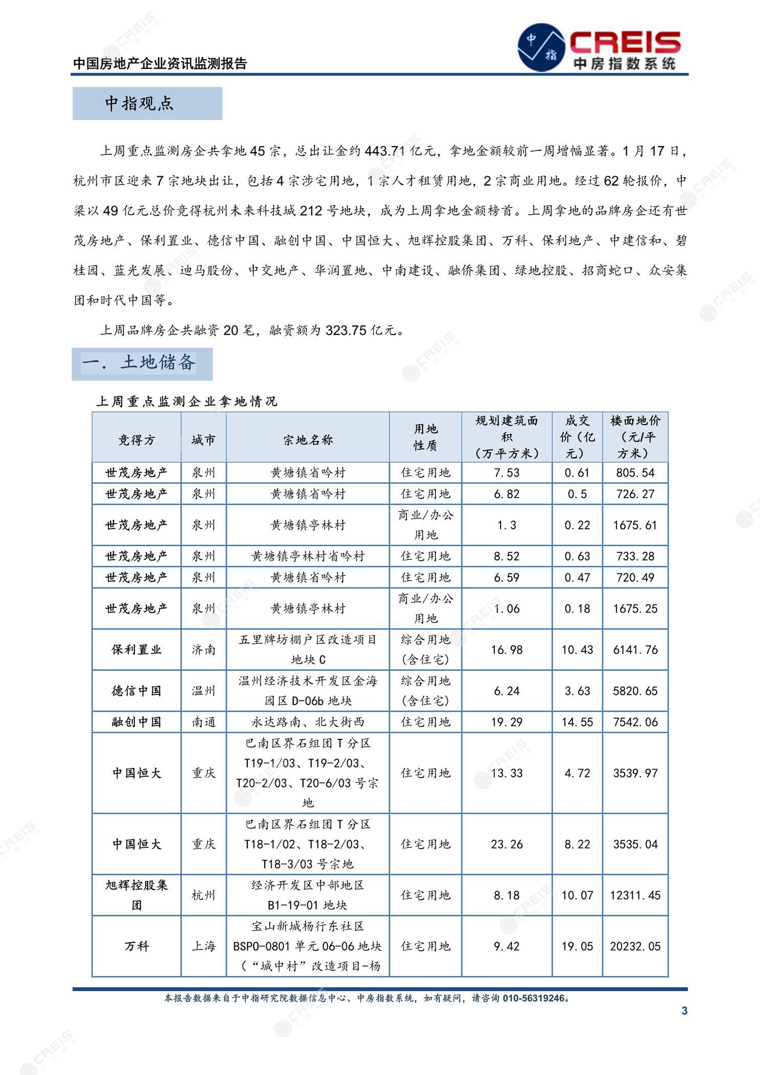 [摘要] 上周重点监测房企共拿地45宗,总出让金约443.71亿元,拿地金额较前一周增幅显著。1月17日,杭州市区迎来7宗地块出让,包括4宗涉宅用地,1宗人才租赁用地,2宗商业用地。经过62轮报价,中梁以49亿元总价竞得杭州未来科技城212号地块,成为上周拿地金额榜首。上周拿地的品牌房企还有世茂房地产、保利置业、德信中国、融创中国、中国恒大、旭辉控股集团、万科、保利地产、中建信和、碧桂园、蓝光发展、迪马股份、中交地产、华润置地、中南建设、融侨集团、绿地控股、招商蛇口、众安集团和时代中国等。 上周品牌房企共融资20笔,融资额为323.75亿元。