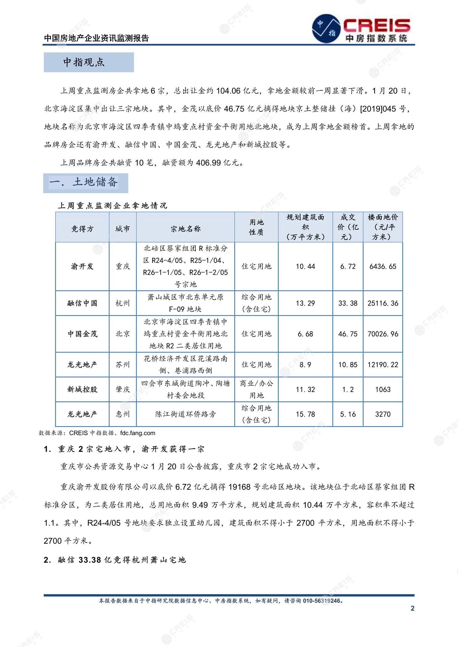 • [摘要] 上周重点监测房企共拿地6宗,总出让金约104.06亿元,拿地金额较前一周显著下滑。1月20日,北京海淀区集中出让三宗地块。其中,金茂以底价46.75亿元摘得地块京土整储挂(海)[2019]045号,地块名称为北京市海淀区四季青镇中坞重点村资金平衡用地北地块,成为上周拿地金额榜首。上周拿地的品牌房企还有渝开发、融信中国、中国金茂、龙光地产和新城控股等。 上周品牌房企共融资10笔,融资额为406.99亿元。