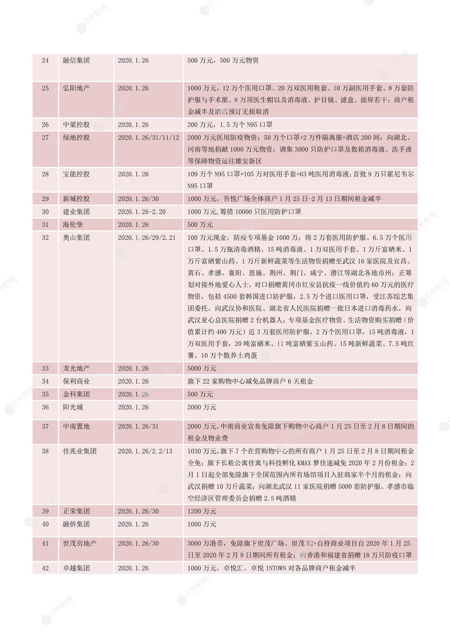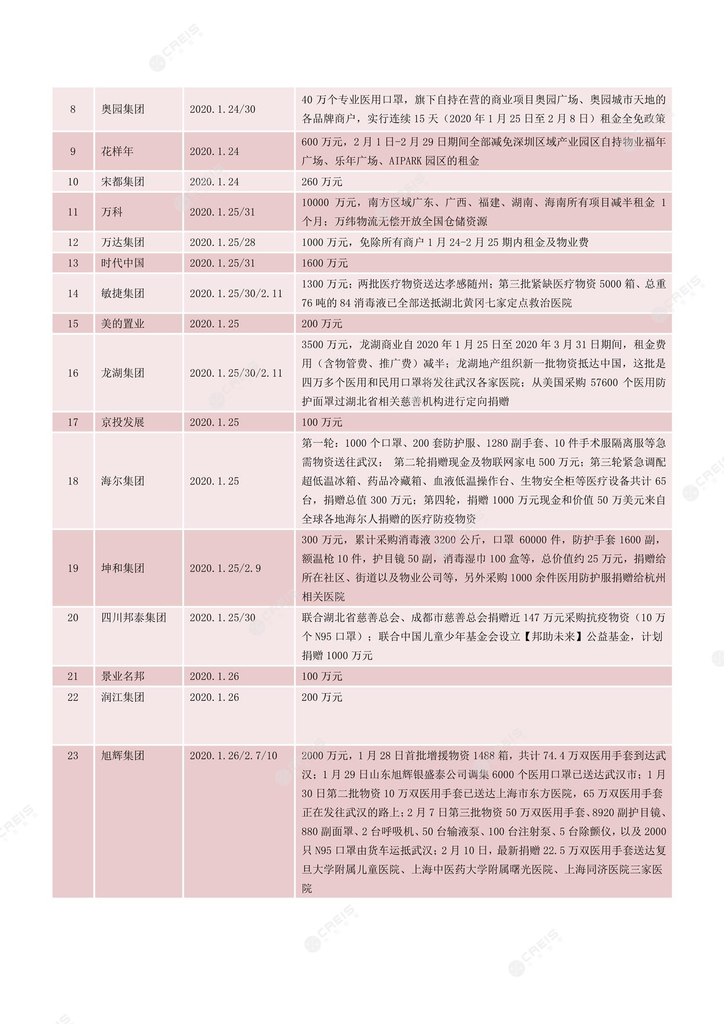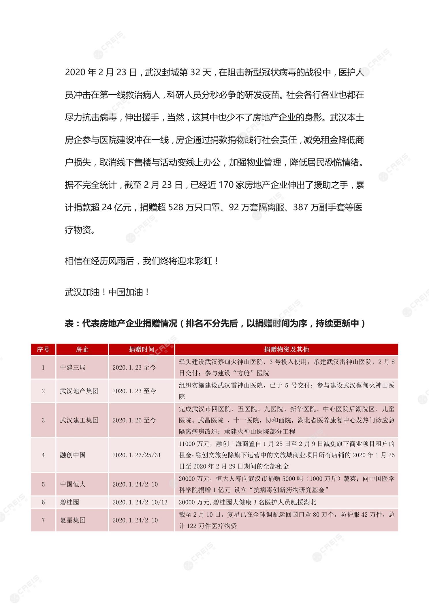[摘要] 2020年2月23日,武汉封城第32天,在阻击新型冠状病毒的战役中,医护人员冲击在第一线救治病人,科研人员分秒必争的研发疫苗。社会各行各业也都在尽力抗击病毒,伸出援手,当然,这其中也少不了房地产企业的身影。武汉本土房企参与医院建设冲在一线,房企通过捐款捐物践行社会责任,减免租金降低商户损失,取消线下售楼与活动变线上办公,加强物业管理,降低居民恐慌情绪。据不完全统计,截至2月23日,已经近170家房地产企业伸出了援助之手,累计捐款超24亿元,捐赠超528万只口罩、92万套隔离服、387万副手套等医疗物资。