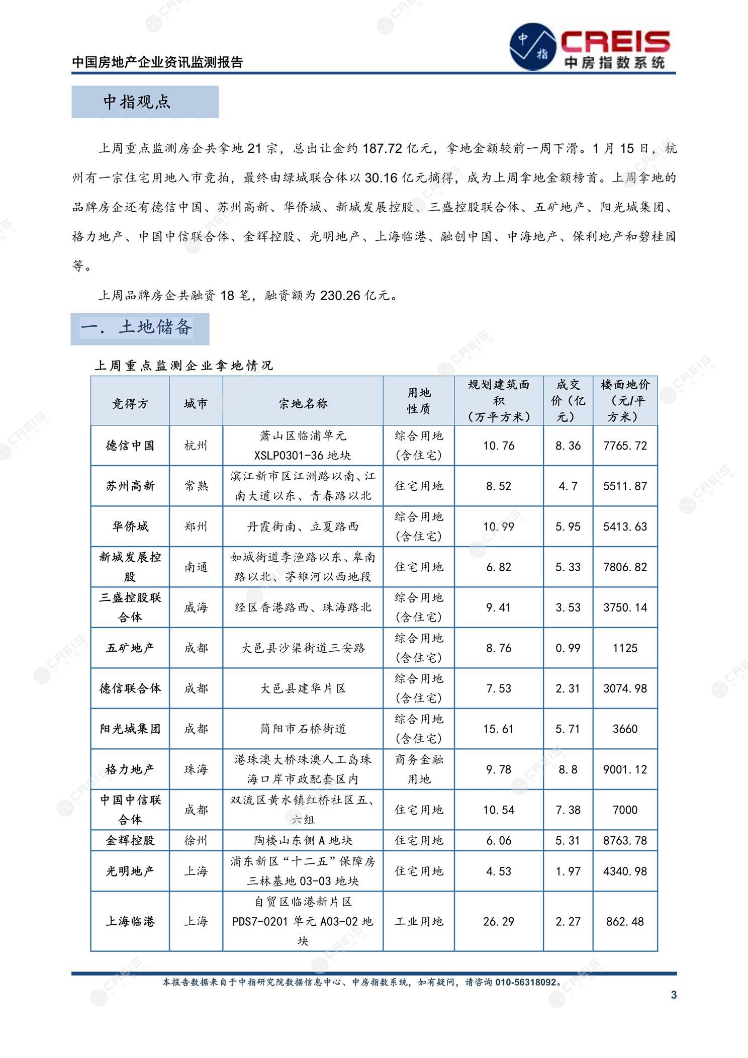 [摘要] 上周重点监测房企共拿地21宗,总出让金约187.72亿元,拿地金额较前一周下滑。1月15日,杭州有一宗住宅用地入市竞拍,最终由绿城联合体以30.16亿元摘得,成为上周拿地金额榜首。上周拿地的品牌房企还有德信中国、苏州高新、华侨城、新城发展控股、三盛控股联合体、五矿地产、阳光城集团、格力地产、中国中信联合体、金辉控股、光明地产、上海临港、融创中国、中海地产、保利地产和碧桂园等。上周品牌房企共融资18笔,融资额为230.26亿元。