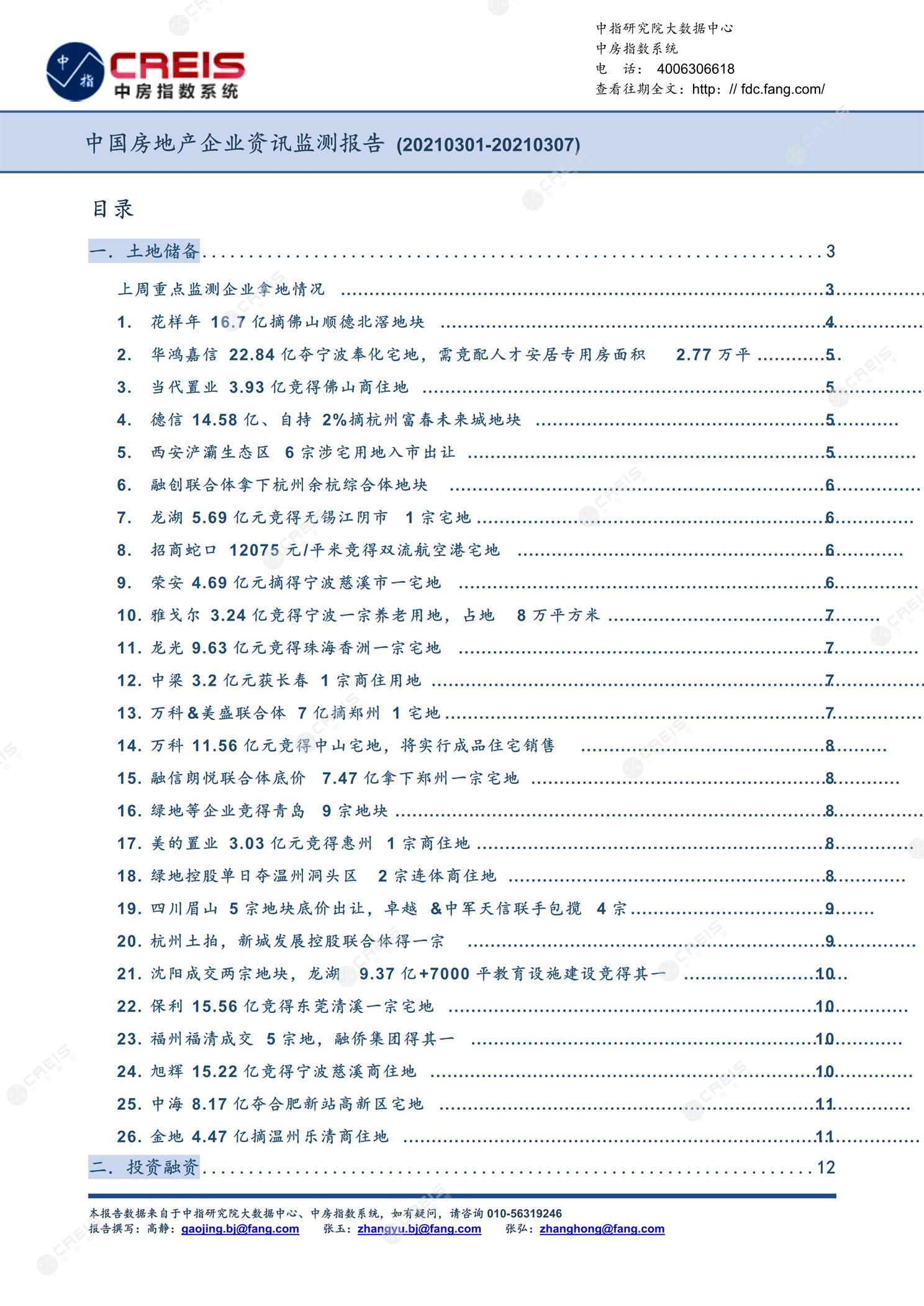 《中国房地产企业资讯监测报告(2021年3月1日-2021年3月7日)》