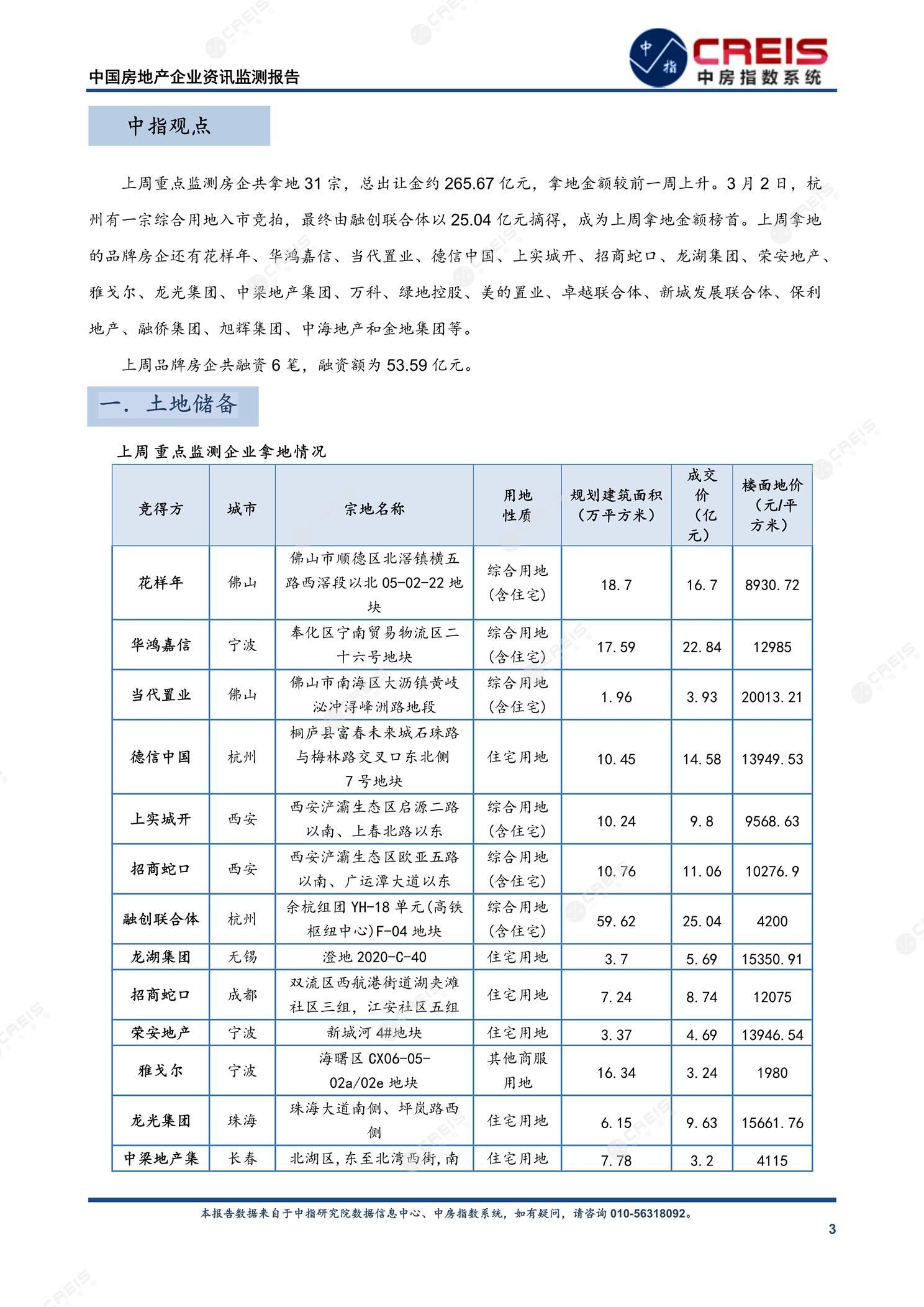 [摘要] 上周重点监测房企共拿地31宗,总出让金约265.67亿元,拿地金额较前一周上升。3月2日,杭州有一宗综合用地入市竞拍,最终由融创联合体以25.04亿元摘得,成为上周拿地金额榜首。上周拿地的品牌房企还有花样年、华鸿嘉信、当代置业、德信中国、上实城开、招商蛇口、龙湖集团、荣安地产、雅戈尔、龙光集团、中梁地产集团、万科、绿地控股、美的置业、卓越联合体、新城发展联合体、保利地产、融侨集团、旭辉集团、中海地产和金地集团等。上周品牌房企共融资6笔,融资额为53.59亿元。