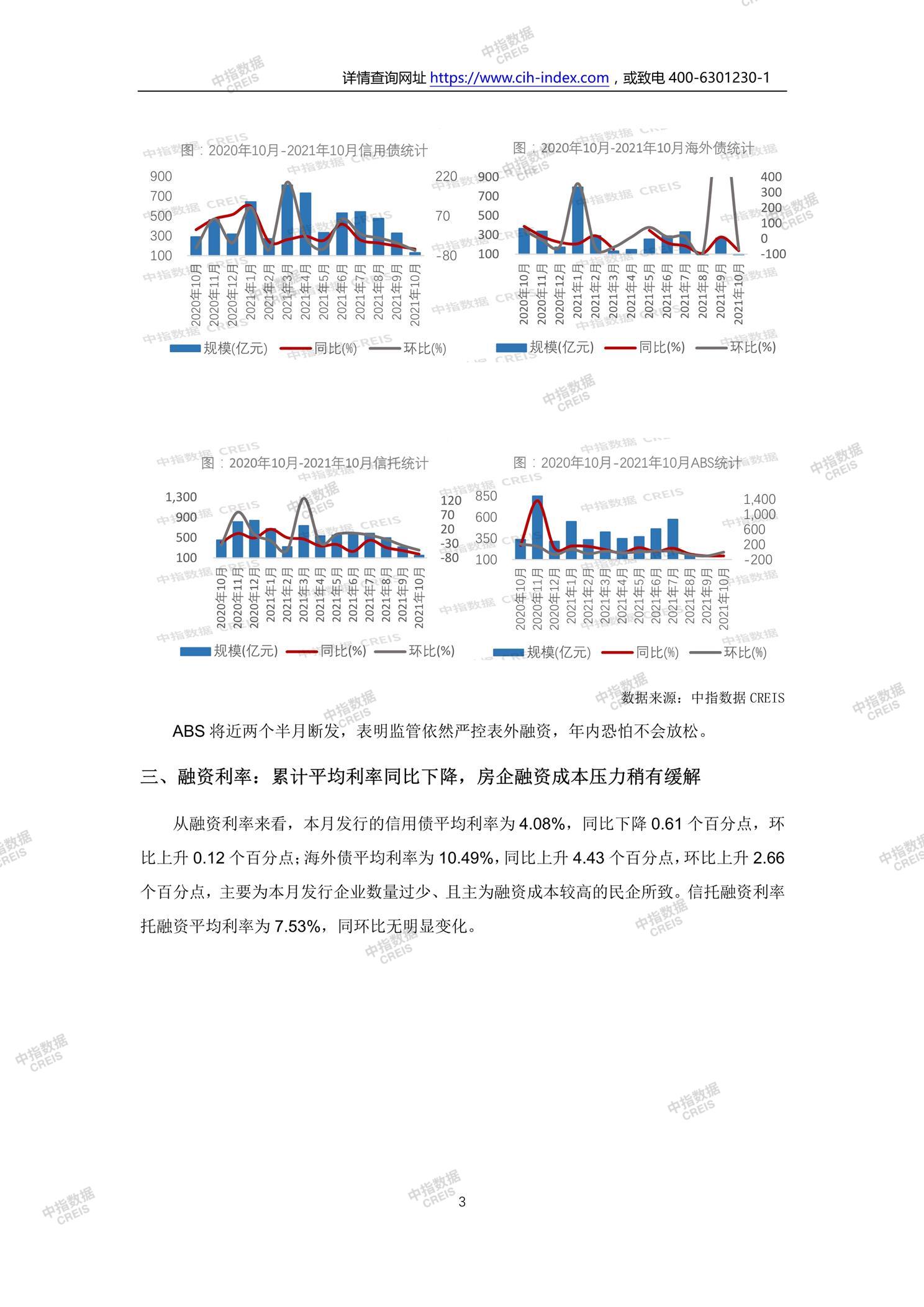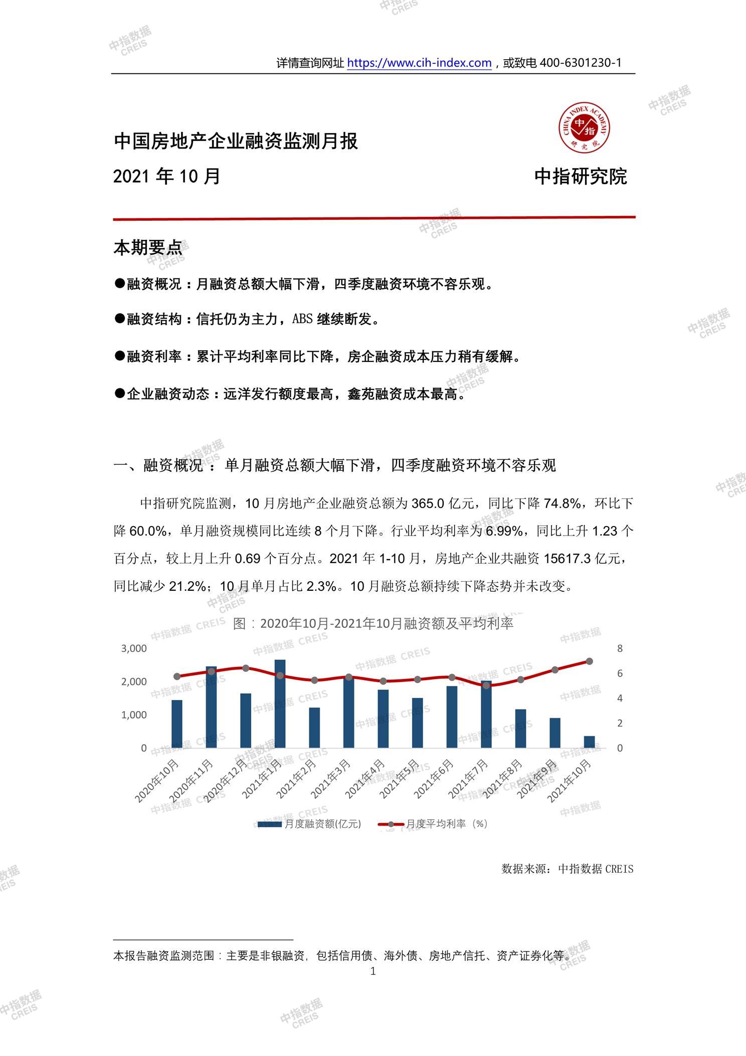 • [摘要] 融资概况:月融资总额大幅下滑,四季度融资环境不容乐观。 融资结构:信托仍为主力,ABS继续断发。 融资利率:累计平均利率同比下降,房企融资成本压力稍有缓解。 企业融资动态:远洋发行额度最高,鑫苑融资成本最高。