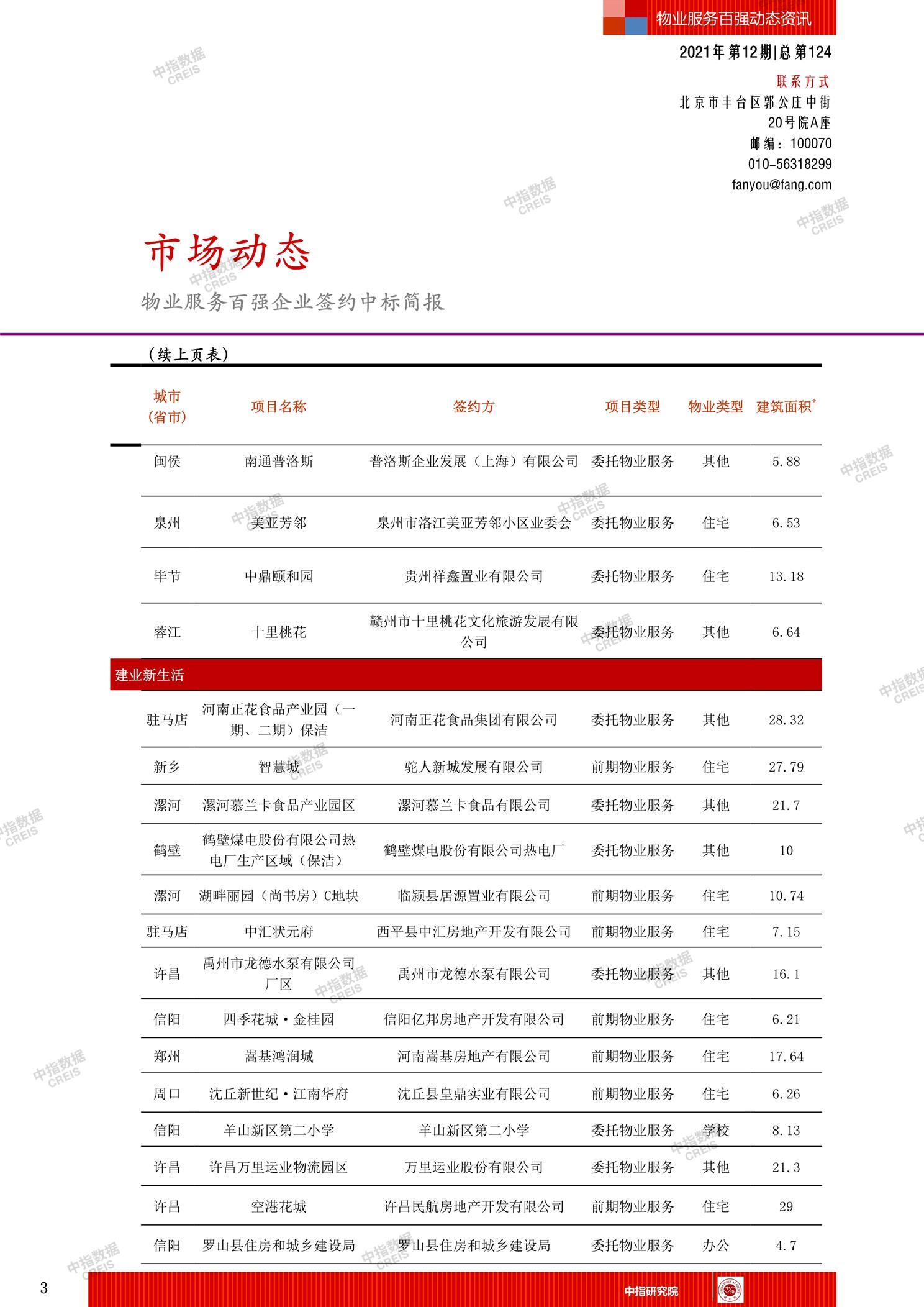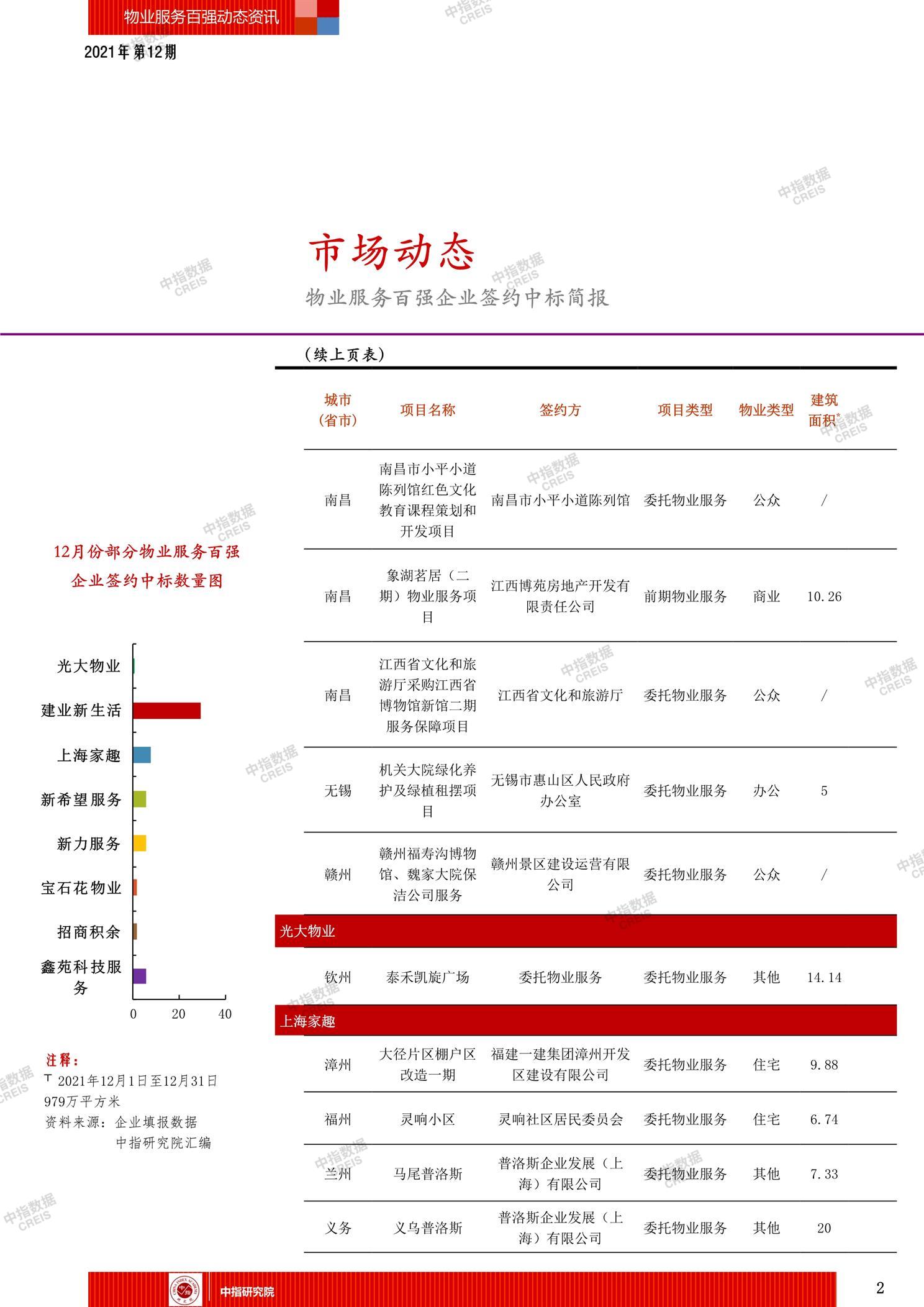 [摘要] 2021年12月物业服务百强企业动态月刊主要围绕市场动态、社区互动、品质服务、企业运营及行业政策法规五大板块展开。在市场动态方面,12月共有12家百强企业披露61项中标项目,涉及规划建筑面积超979万平方米,项目类型涵盖住宅、学校、商业等多种业态。社区互动板块重点报道了融创服务、奥园健康等企业开展的业主答谢宴、便民服务及公益活动,通过多样化社区活动增强邻里互动与业主满意度。品质服务部分展示了企业通过技能竞赛、标准化建设、智慧化升级(如防阻电动车入电梯系统)等方式提升服务质量,同时疫情期间的防控措施(如鑫苑服务在西安的“数”读战“疫”)也得到突出体现。企业运营方面,雅生活集团、合生活等通过战略合作、校企联动、数字化转型(如企业微信应用)等方式拓展业务布局,部分企业如越秀服务因独特业务模式获得资本市场认可。行业政策法规板块提及《“十四五”推动高质量发展的国家标准体系建设规划》等文件,强调标准化建设及疫情防控配合要求。整体来看,报告反映了物业行业在服务创新、技术应用、社会责任及政策响应上的积极实践。 【此内容为AI自动生成】