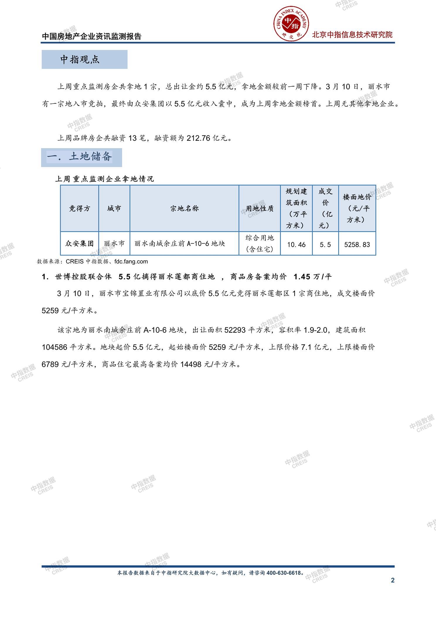 • [摘要] 上周重点监测房企共拿地1宗,总出让金约5.5亿元,拿地金额较前一周下降。3月10日,丽水市有一宗地入市竞拍,最终由众安集团以5.5亿元收入囊中,成为上周拿地金额榜首。上周无其他拿地企业。 上周品牌房企共融资13笔,融资额为212.76亿元。