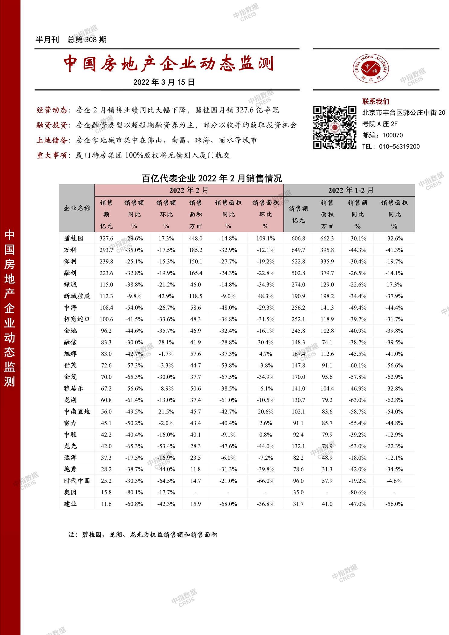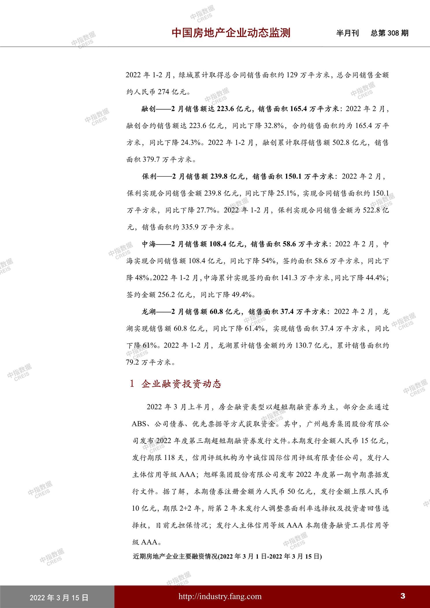 • [摘要] 经营动态:房企2月销售业绩同比大幅下降,碧桂园月销327.6亿夺冠 融资投资:房企融资类型以超短期融资券为主,部分以收并购获取投资机会 土地储备:房企拿地城市集中在佛山、南昌、珠海、丽水等城市 重大事项:厦门特房集团100%股权将无偿划入厦门轨交