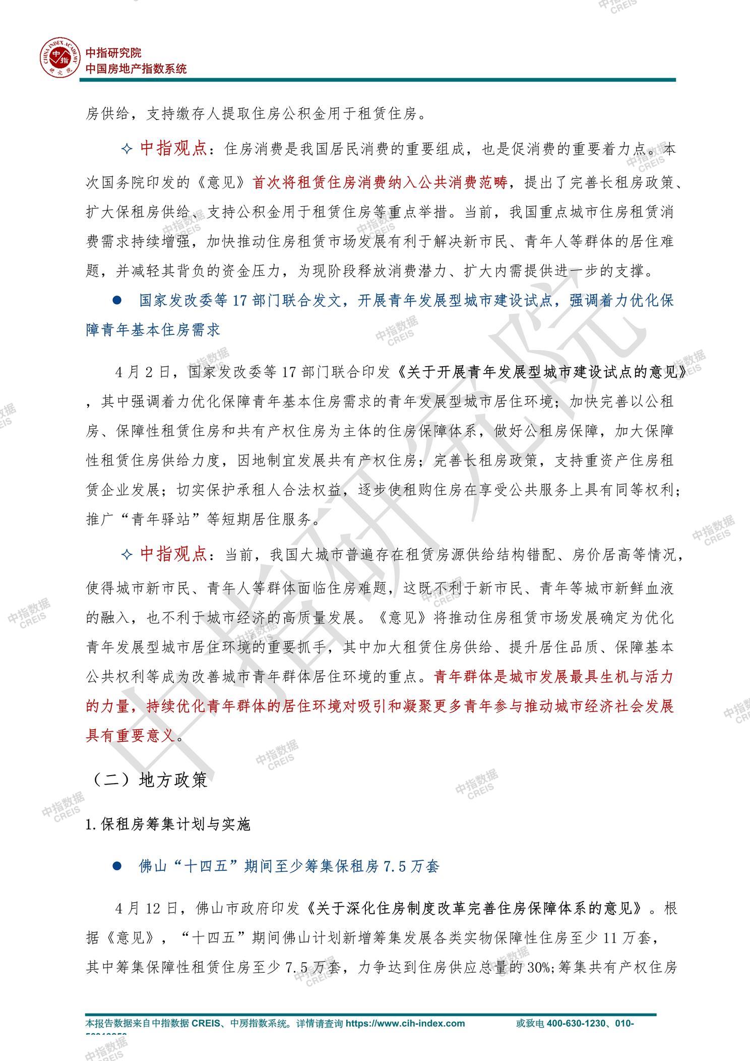 [摘要] 近年来,“坚持租购并举,加快发展长租房市场,推进保障性住房建设”成为我国住房市场发展的重点内容。随着“租购并举”住房制度的持续建设,我国住房租赁市场的发展不断提速,“十四五”时期40个重点城市计划筹集保障性租赁住房650万套,越来越多的企业开始关注并布局住房租赁领域。5月11日,长沙发布《关于推进长沙市租赁住房多主体供给多渠道保障盘活存量房的试点实施方案》,盘活存量住房,激活增量需求,为实现“租购并举”给出了“长沙方案”。中指研究院将持续跟进住房租赁市场相关动态,定期发布住房租赁市场月报,为市场参与者提供更多信息与数据支持。