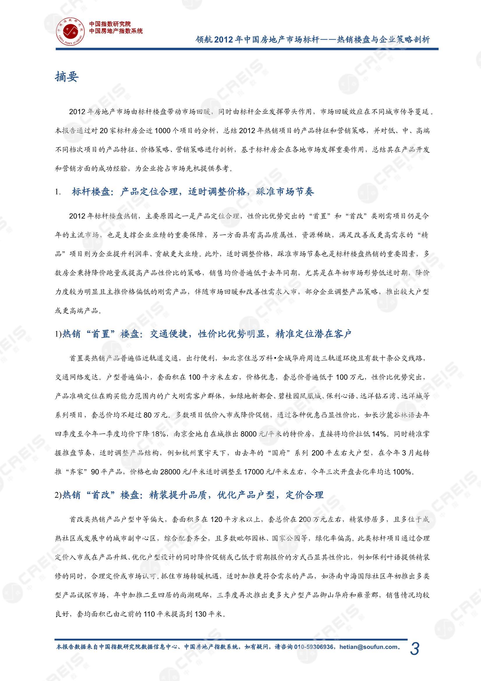 [摘要] 2012年房地产市场由标杆楼盘带动市场回暖,同时由标杆企业发挥带头作用,市场回暖效应在不同城市传导蔓延。本报告通过对20家标杆房企近1000个项目的分析,总结2012年热销项目的产品特征和营销策略,并对低、中、高端不同档次项目的产品特征、价格策略、营销策略进行剖析,基于标杆房企在各地市场发挥重要作用,总结其在产品开发和营销方面的成功经验,为企业抢占市场先机提供参考。 1.标杆楼盘:产品定位合理,适时调整价格,踩准市场节奏 1)热销“首置”楼盘:交通便捷,性价比优势明显,精准定位潜在客户 2)热销“首改”楼盘:精装提升品质,优化产品户型,定价合理 3)热销“精品”楼盘:区位或环境优越,内外兼修打造高品质 2.标杆房企:顺应市场大势,紧跟需求变化,优化产品体系 1)顺应市场大势,合理布局把握东部一二线城市的回暖良机 2)紧跟客户需求变化,优化产品体系,推出适销对路产品