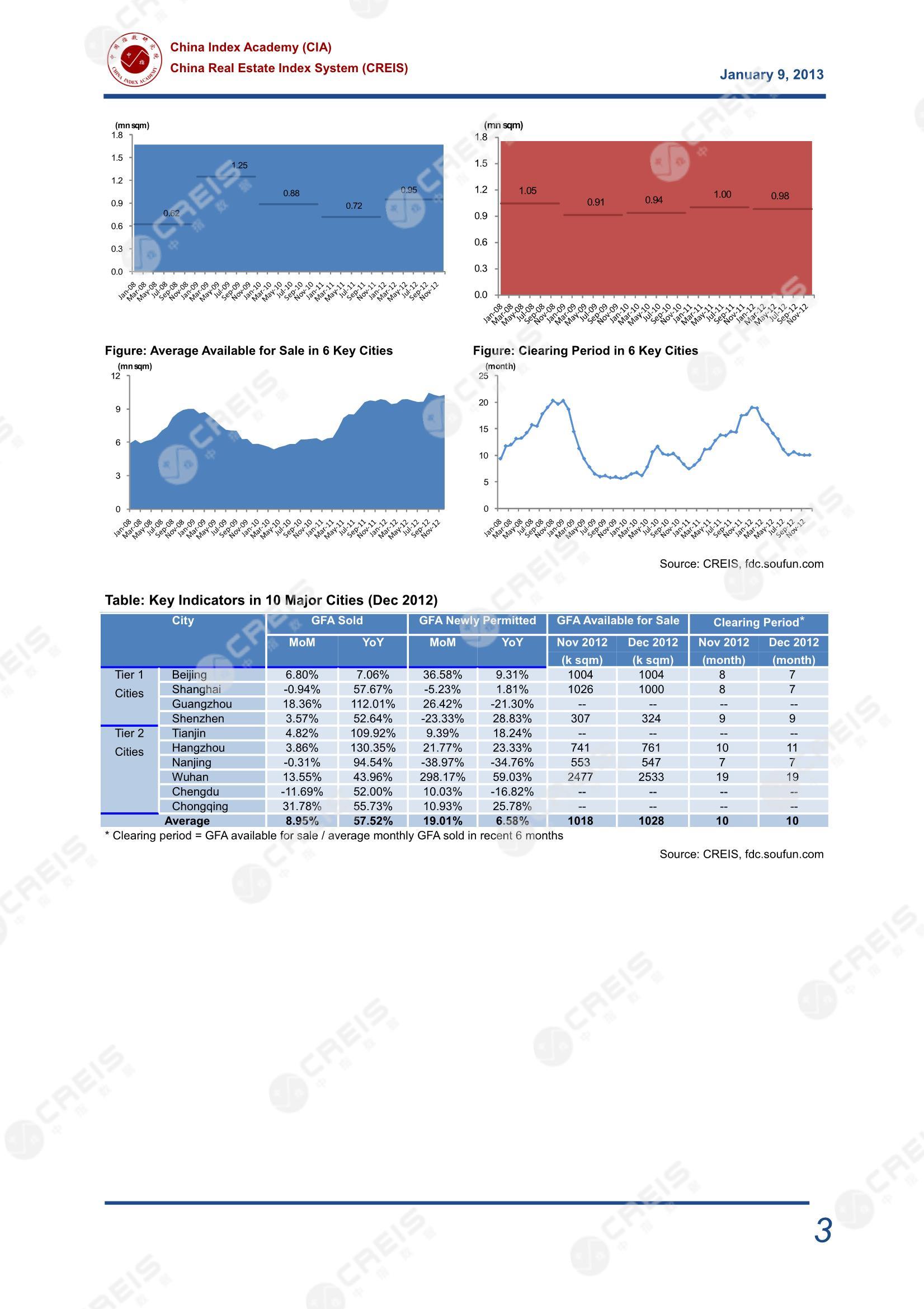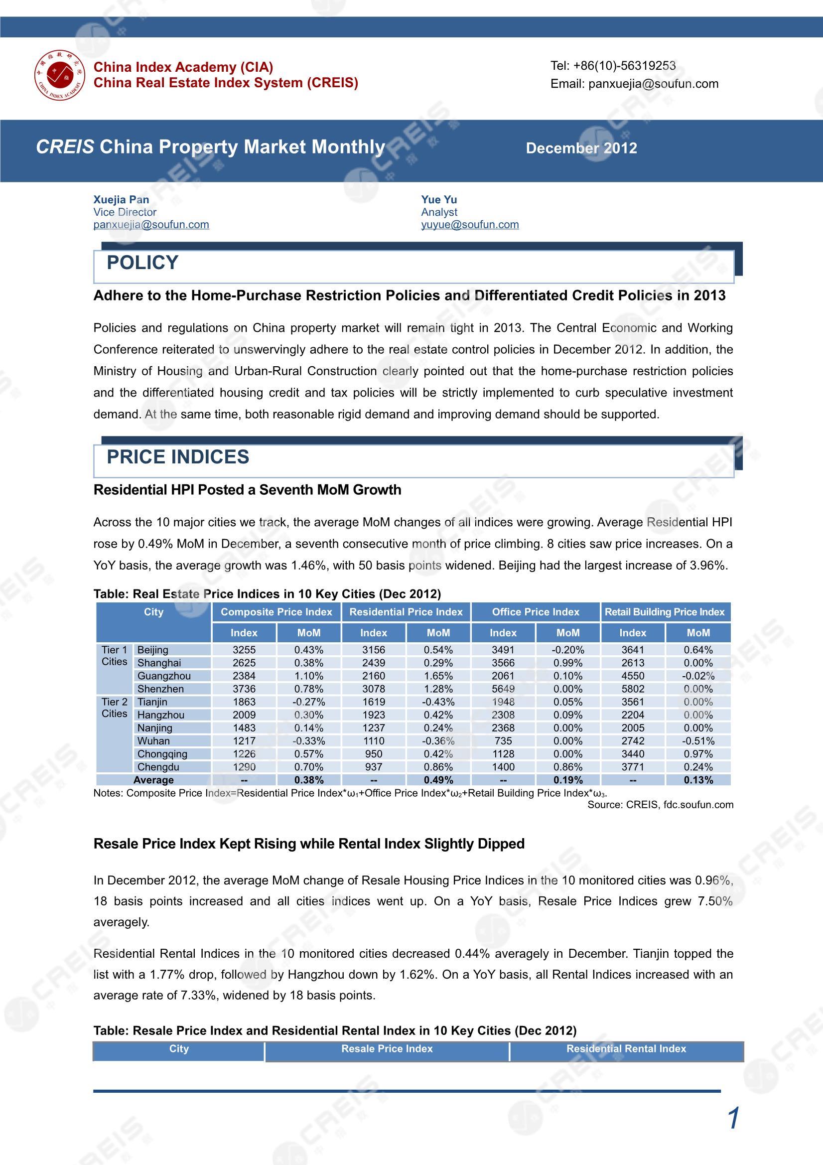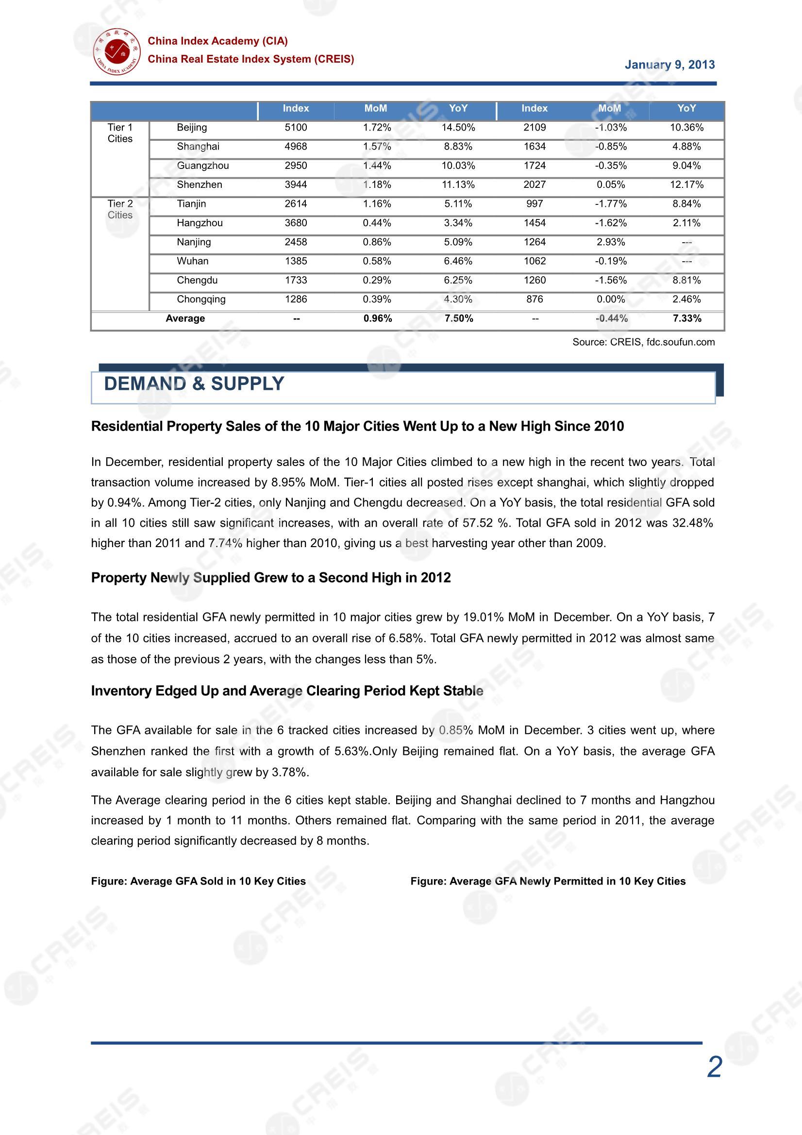 [摘要] Adhere to the Home-Purchase Restriction Policies and Differentiated Credit Policies in 2013. Residential HPI Posted a Seventh MoM Growth. Resale Price Index Kept Rising while Rental Index Slightly Dipped. Residential Property Sales of the 10 Major Cities Went Up to a New High Since 2010. Property Newly Supplied Grew to a Second High in 2012. Inventory Edged Up and Average Clearing Period Kept Stable. Sales and GFA Sold of Major Developers Increased Continuously. Land Acquired Increased in December, but Total Land Acquired Was Still Less Than 2011.