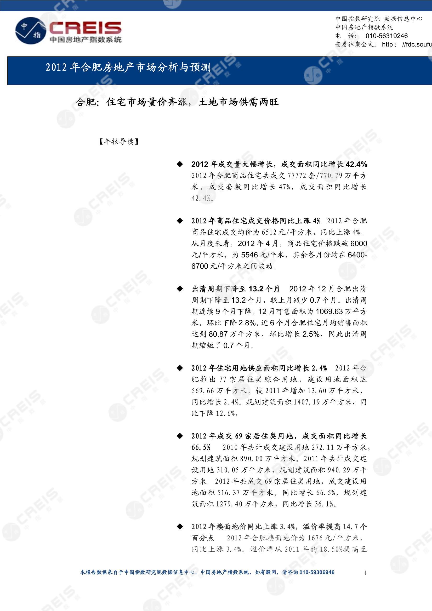 [摘要] 合肥:住宅市场量价齐涨,土地市场供需两旺 【年报导读】  2012年成交量大幅增长,成交面积同比增长42.4% 2012年合肥商品住宅共成交77772套/770.79万平方米,成交套数同比增长47%,成交面积同比增长42.4%。  2012年商品住宅成交价格同比上涨4% 2012年合肥商品住宅成交均价为6512元/平方米,同比上涨4%。从月度来看,2012年4月,商品住宅价格跌破6000元/平方米,为5546元/平米,其余各月份均在6400-6700元/平方米之间波动。  出清周期下降至13.2个月 2012年12月合肥出清周期下降至13.2个月,较上月减少0.7个月。出清周期连续9个月下降。12月可售面积为1069.63万平方米,环比下降2.8%。近6个月合肥住宅月均销售面积达到80.87万平方米,环比增长2.5%,因此出清周期缩短了0.7个月。  2012年住宅用地供应面积同比增长2.4% 2012年合肥推出77宗居住类综合用地,建设用地面积达569.66万平方米,较2011年增加13.60万平方米,同比增长2.4%。规划建筑面积1407.19万平方米,同比下降12.6%,  2012年成交69宗居住类用地,成交面积同比增长66.5% 2010年共计成交建设用地272.11万平方米,规划建筑面积890.00万平方米。2011年共计成交建设用地310.05万平方米,规划建筑面积940.29万平方米。2012年共成交69宗居住类用地,成交建设用地面积516.37万平方米,同比增长66.5%,规划建筑面积1279.40万平方米,同比增长36.1%。  2012年楼面地价同比上涨3.4%,溢价率提高14.7个百分点 2012年合肥楼面地价为1676元/平方米,同比上涨3.4%。溢价率从2011年的18.50%提高至33.17%。