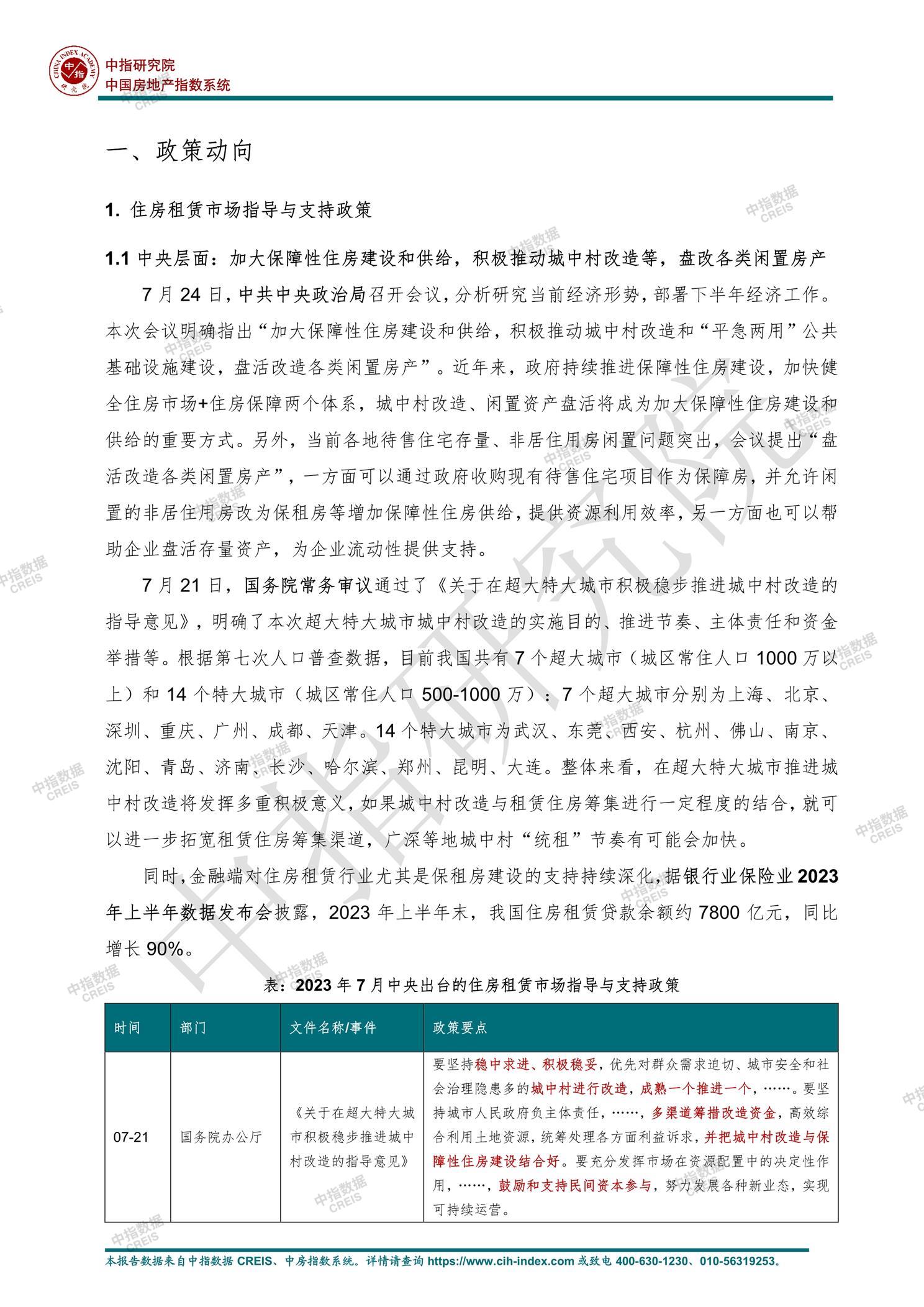 [摘要] 7月24日,中共中央政治局会议指出“加大保障性住房建设和供给,积极推动城中村改造……,盘活改造各类闲置房产”。今年以来,超大特大城市城中村改造相关内容被多次提及,若城中村改造与租赁住房进行结合,可进一步拓宽租赁住房筹集渠道。7月,全国50个城市住宅平均租金为37.0元/平方米/月,环比上涨0.20%,涨幅较上月扩大0.08个百分点;同比下跌0.95%,跌幅较上月收窄0.11个百分点。