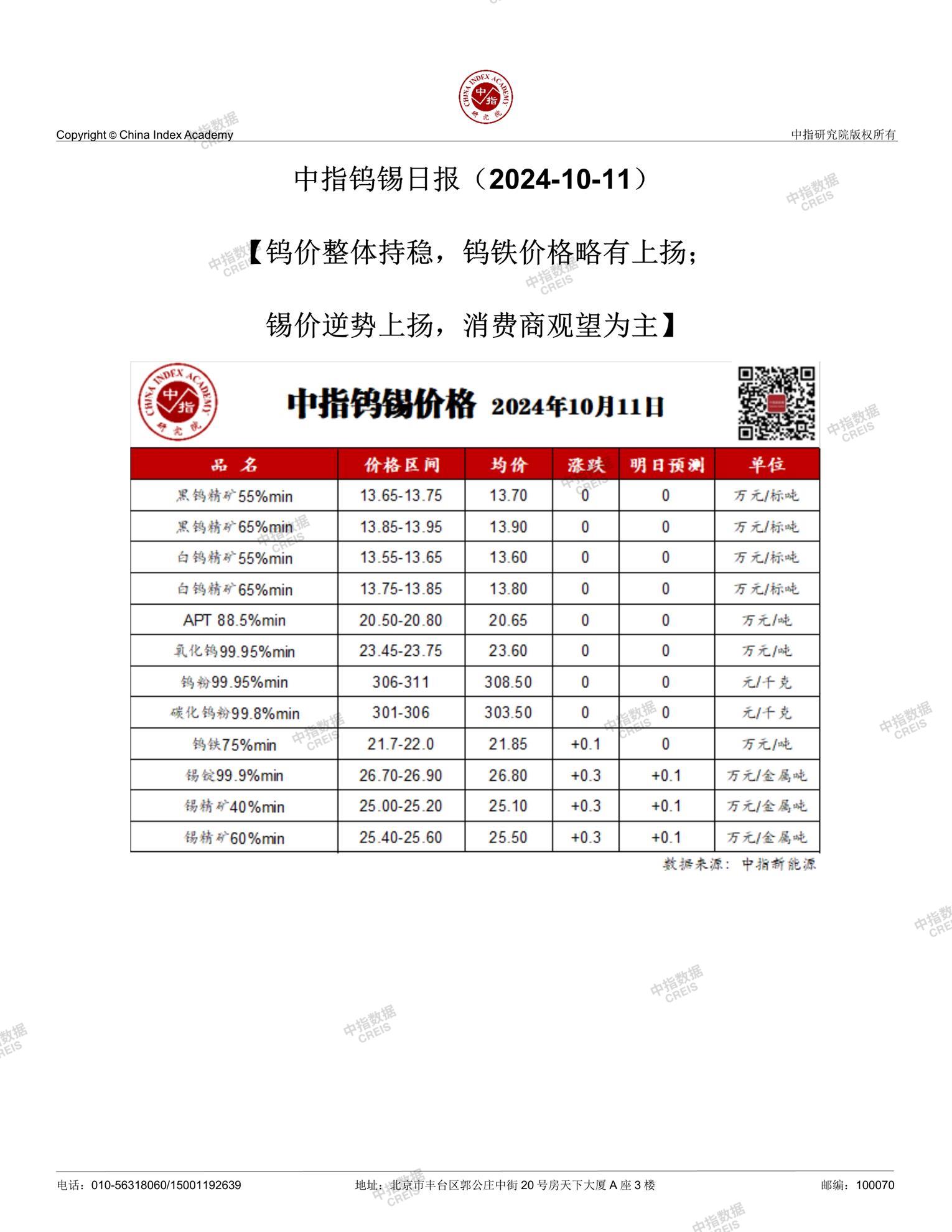 中指钨锡日报(2024-10-11)【钨价整体持稳,钨铁价格略有上扬;锡价逆势上扬,消费商观望为主】