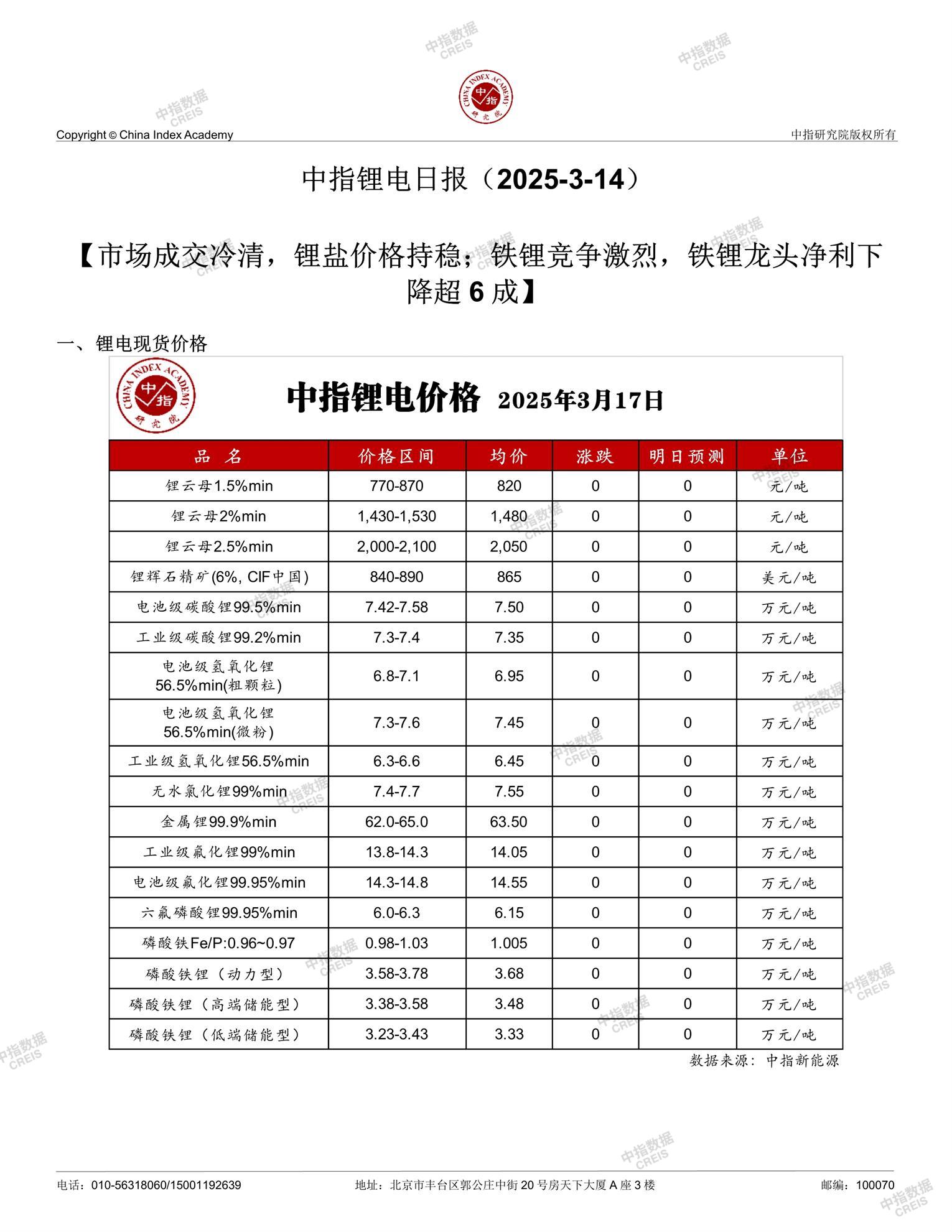 中指锂电日报(2025-3-17)【市场成交冷清,锂盐价格持稳;铁锂竞争激烈,铁锂龙头净利下降超6成】