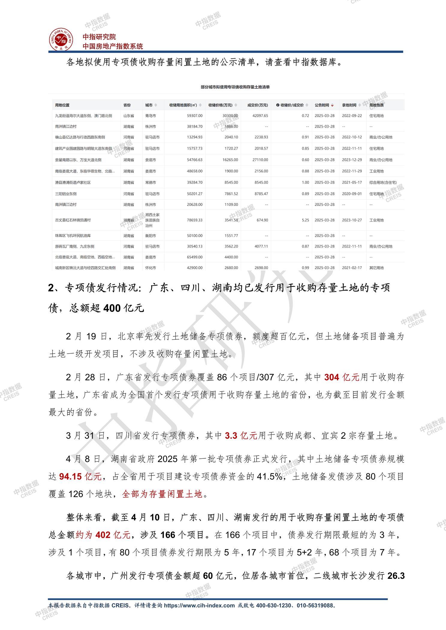 [摘要] 2025年上半年,专项债收购存量闲置土地成为促进房地产市场稳定的关键举措。根据自然资源部和财政部联合发布的文件,各地加快公示拟使用专项债收储土地,截至4月10日,全国公示拟收储土地850宗,总面积超4000万平方米,总金额达1282亿元。其中广东省以496亿元位居首位,湖南、福建、四川等地紧随其后。惠州市以127.5亿元的拟收储价格成为各城市之首。从土地类型看,住宅用地占比超60%,商办用地占26%,工业用地占7%。地块成交时间集中在2020-2024年,地方国企为主要用地单位。收储价格方面,超50%的地块拟收储价格与成交价比值在0.8-1.0之间。广东、四川、湖南已发行专项债用于收购存量土地,总额达402亿元,其中广东省占比最高。未来政策将着力解决专项债额度不清晰、收购价格难确定等问题,预计更多地区将加快发债节奏。中央和地方政策持续完善,旨在通过专项债收储闲置土地调节市场供需,缓解地方政府和房企压力。 【此内容为AI自动生成】